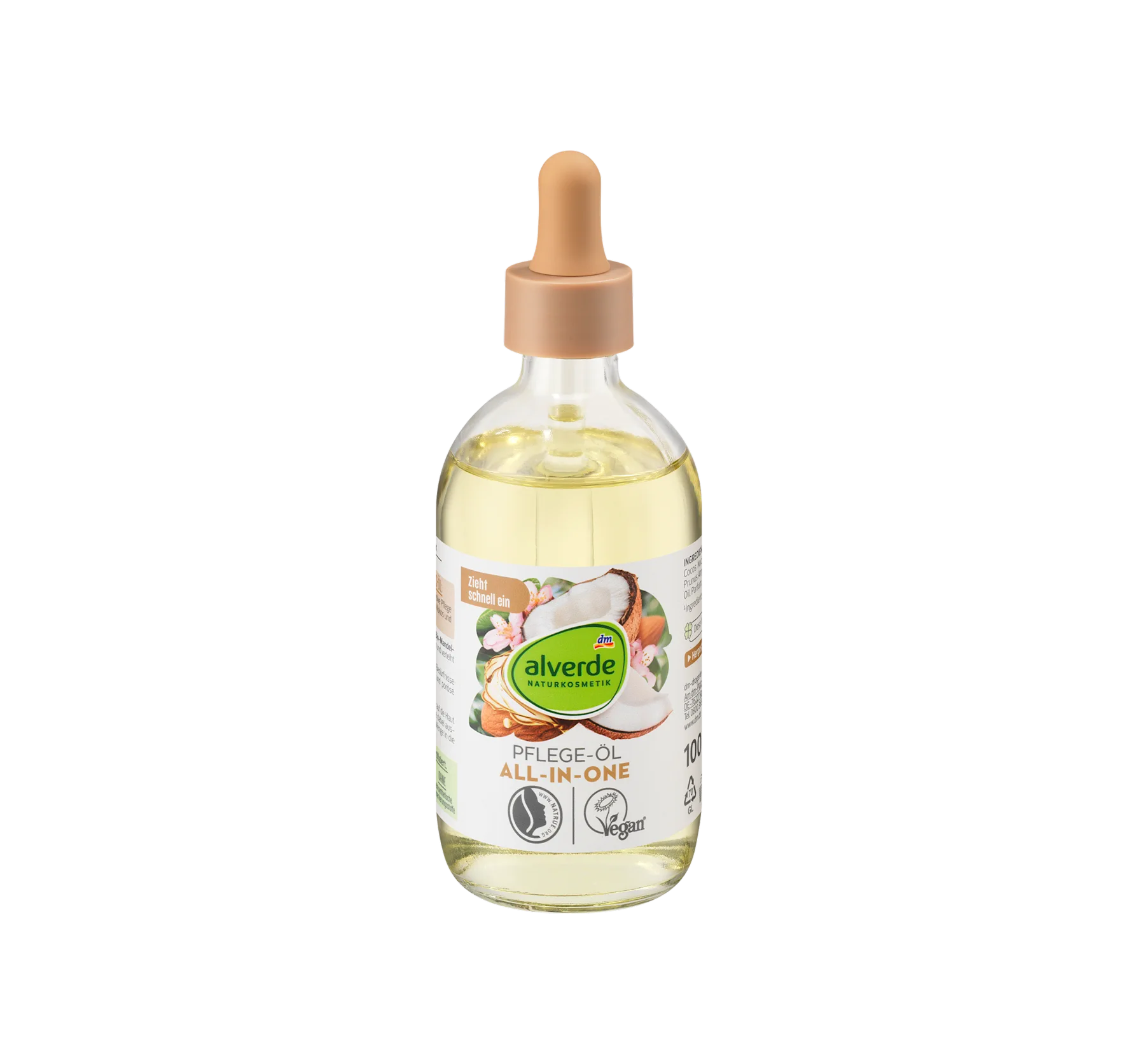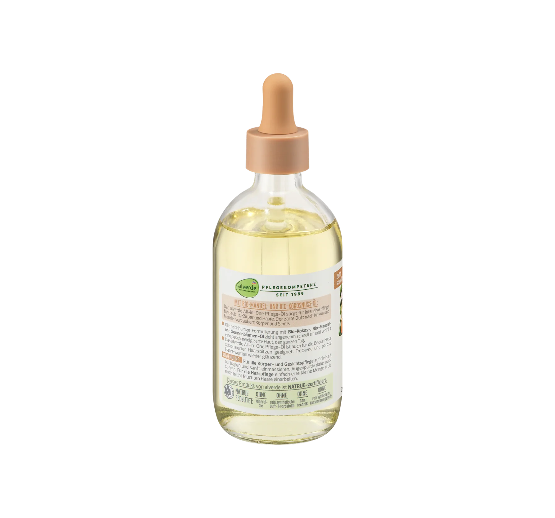 The rich formula of alverde Naturkosmetik's All-in-One Care Oil with organic coconut, organic almond, and sunflower oil absorbs quickly and leaves your skin feeling soft and supple all day long....