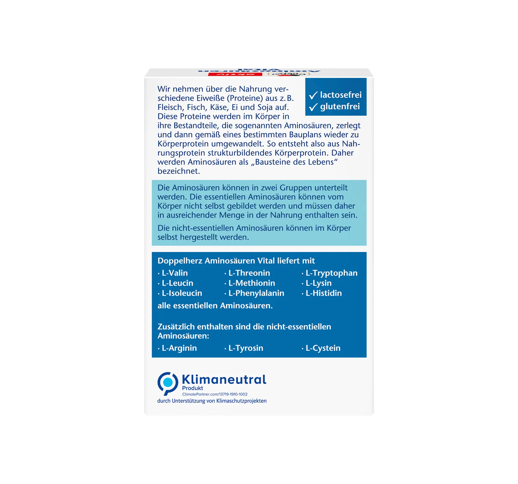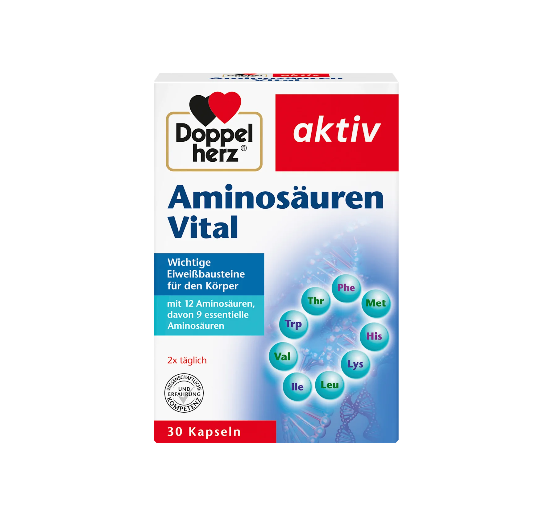 Doppelherz active amino acids vital for dietary supplements contains twelve different amino acids, including nine essential amino acids.
