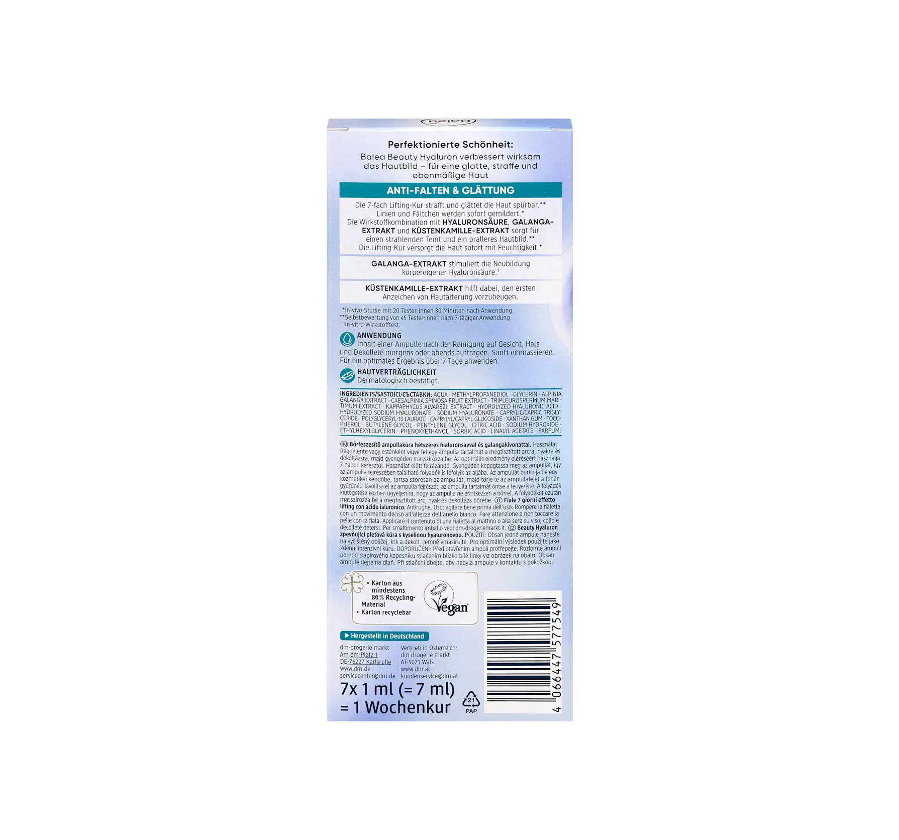 The Balea Beauty Effect Lifting Treatment increases your skin's elasticity and firmness. Cell activity is supported, and wrinkles are reduced. Hyaluronic acid, a natural moisturizing factor, act...