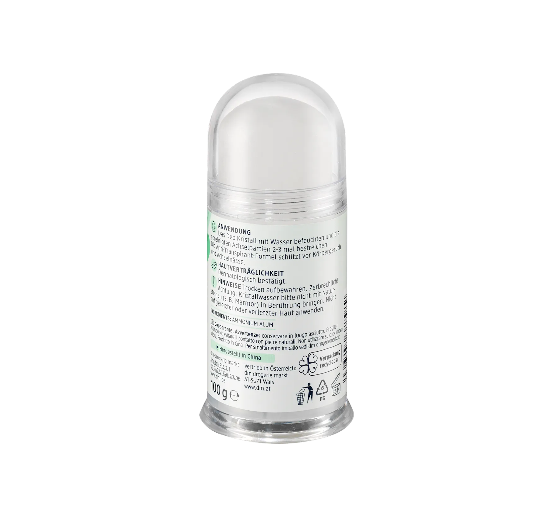 Store in a dry place. Fragile. Caution: Do not allow crystal water to come into contact with natural stones (e.g., marble). Do not use on irritated or damaged skin. Exact product name: Deodorant Crystal Stick