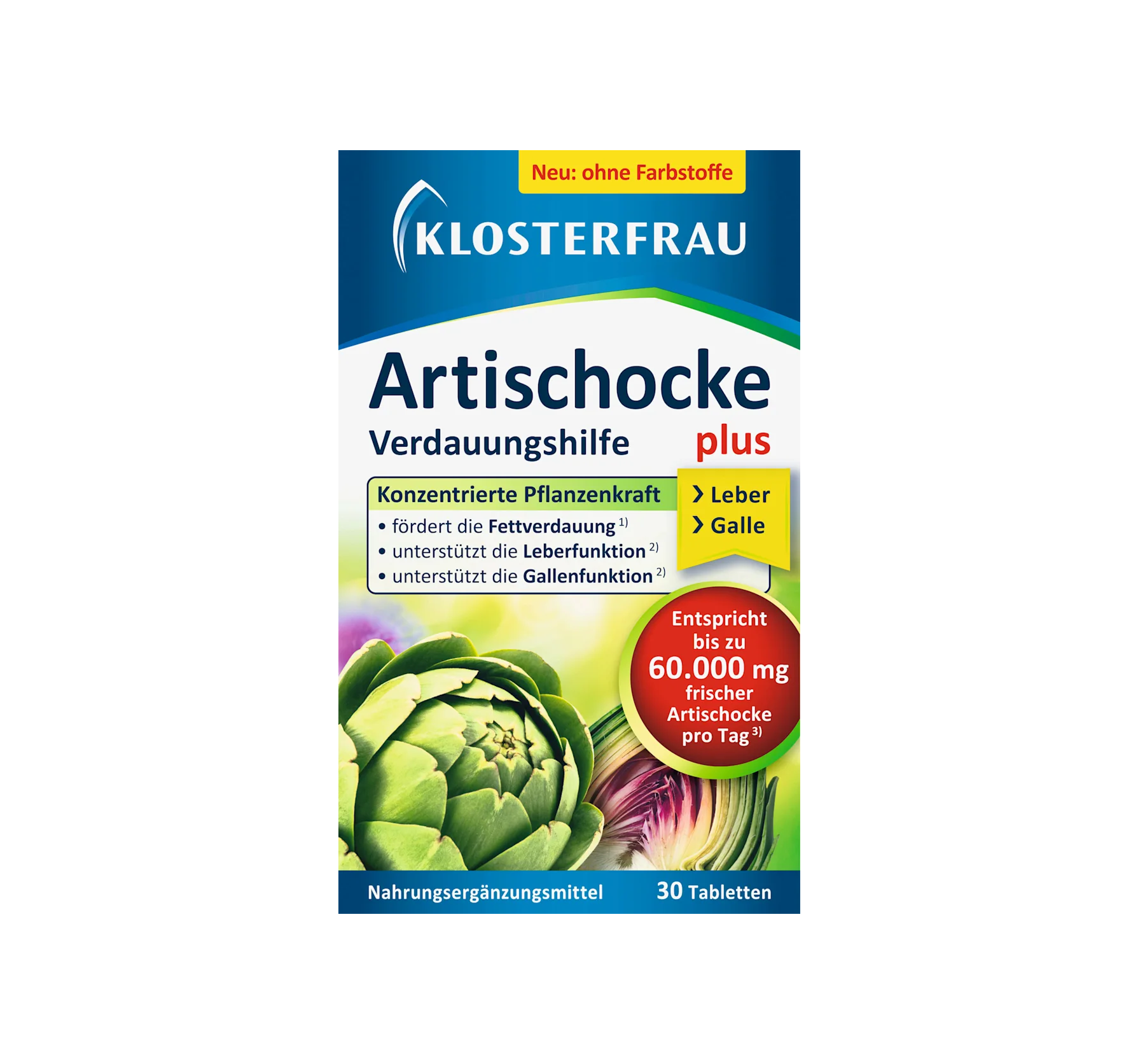 Klosterfrau Artichoke plus Dandelion + Ginger Forte 600 is a digestive aid. The body needs bile to digest dietary fats. Bitter plants such as artichoke and dandelion stimulate the production of ...
