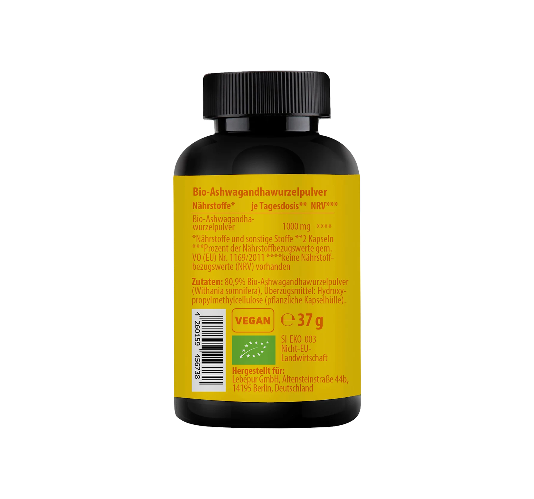 Lebepur's organic Ashwagandha capsules are ideal for incorporating into your daily diet. Thanks to their capsule form, the dietary supplement is convenient for on-the-go use and can even be take...