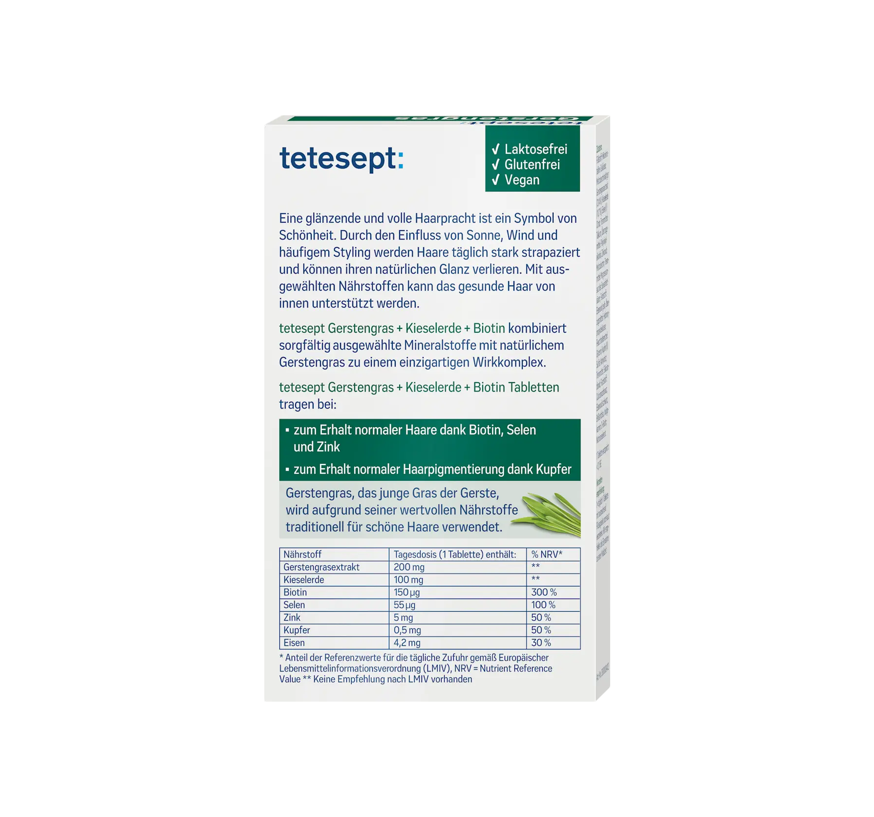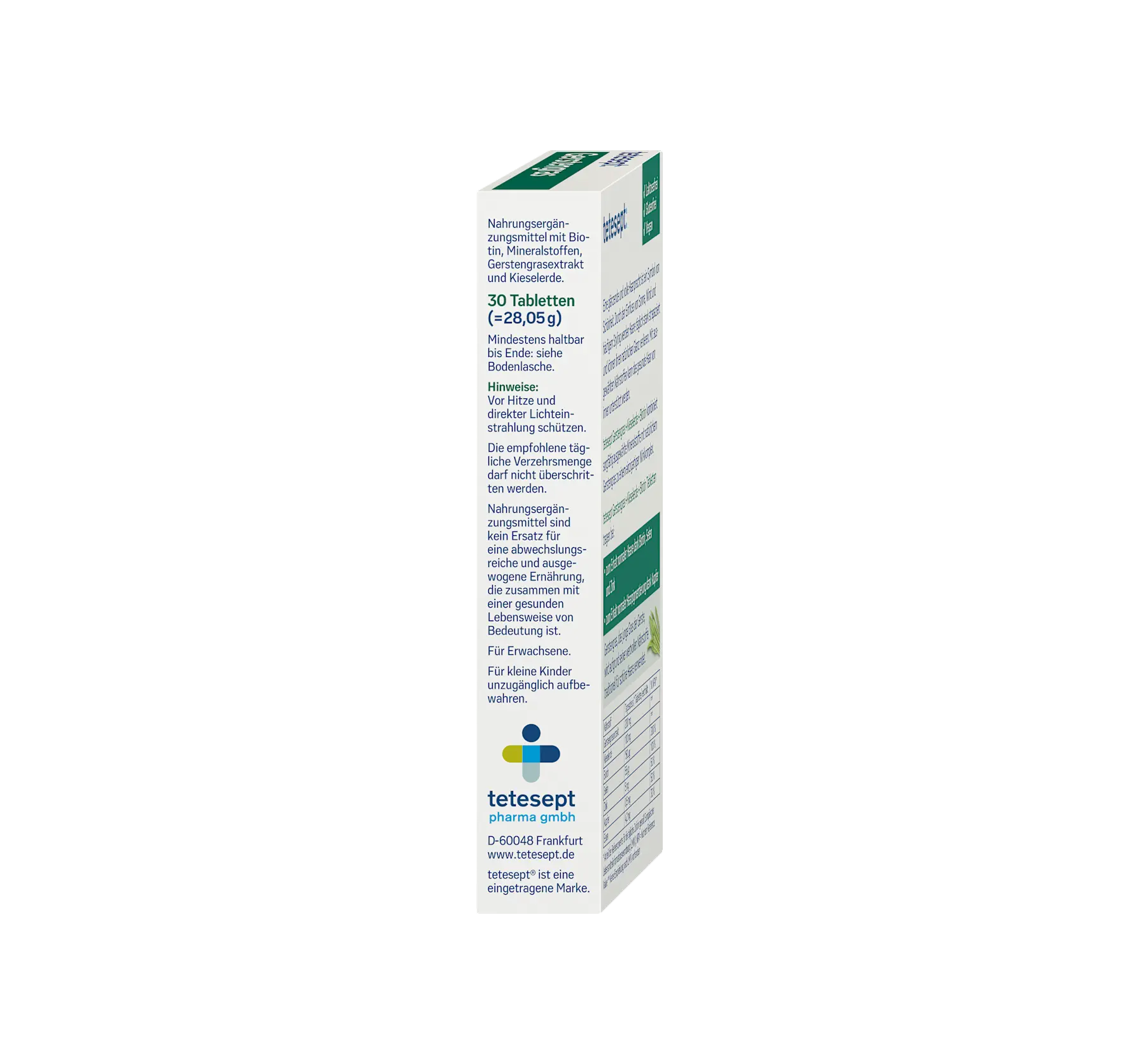 tetesept Barley Grass + Silica + Biotin tablets combine carefully selected minerals with natural barley grass to create a unique active complex. Selected nutrients support healthy hair from with...