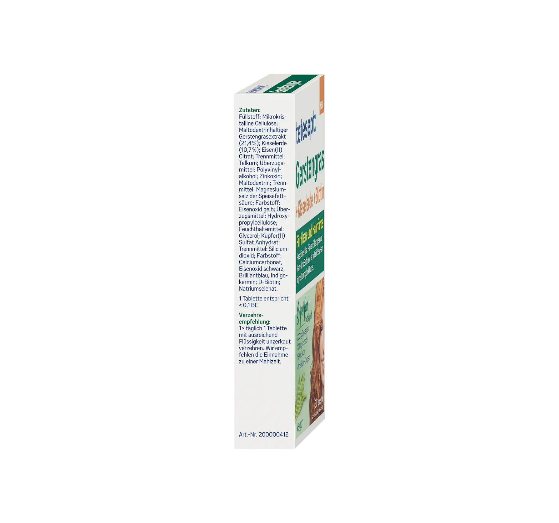 EXACT PRODUCT NAME: FOOD SUPPLEMENT WITH BIOTIN, MINERALS, BARLEY GRASS EXTRACT AND SILICA. INGREDIENTS: BULKING AGENT: MICROCRYSTALLINE CELLULOSE; MALTODEXTRIN-CONTAINING BARLEY GRASS EXTRACT (21.4%); SILICA (10.7%); IRON(II) CITRATE; ANTI-CAKING AGENT: TALC; GLAZING AGENT: POLYVINYL ALCOHOL; ZINC OXIDE; MALTODEXTRIN; ANTI-CAKING AGENT: MAGNESIUM SALT OF FATTY ACID; COLOR: IRON OXIDE YELLOW; GLAZING AGENT: HYDROXYPROPYL CELLULOSE; HUMECTANT: GLYCEROL; COPPER(II) SULFATE ANHYDRATE; ANTI-CAKING AGENT: SILICON DIOXIDE; COLOR: CALCIUM CARBONATE, IRON OXIDE BLACK, BRILLIANT BLUE, INDIGO CARMINE; D-BIOTIN; SODIUM SELENATE
