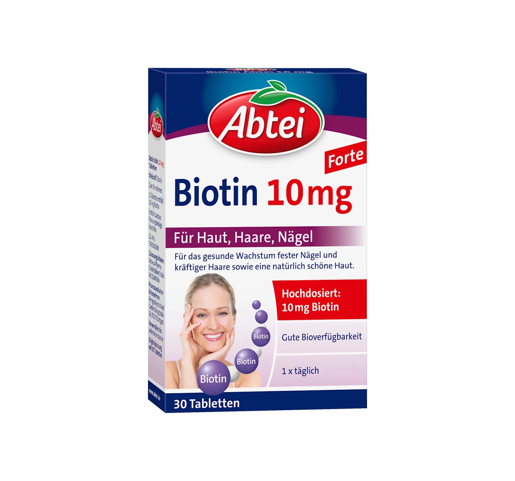 Abtei's Biotin 10 mg tablets contain a high dose of biotin, which can contribute to skin cell regeneration and strengthen fingernails and hair. The drug can also help prevent biotin deficiency a...
