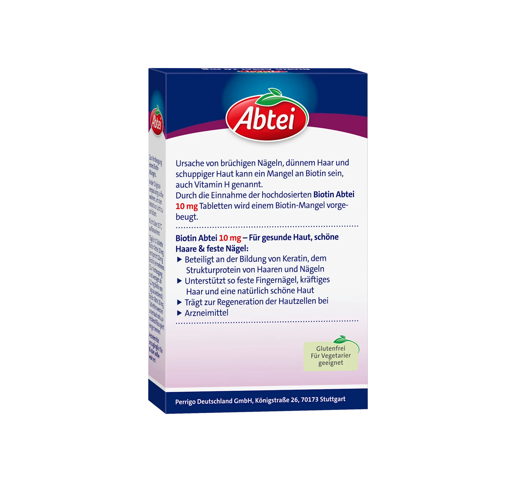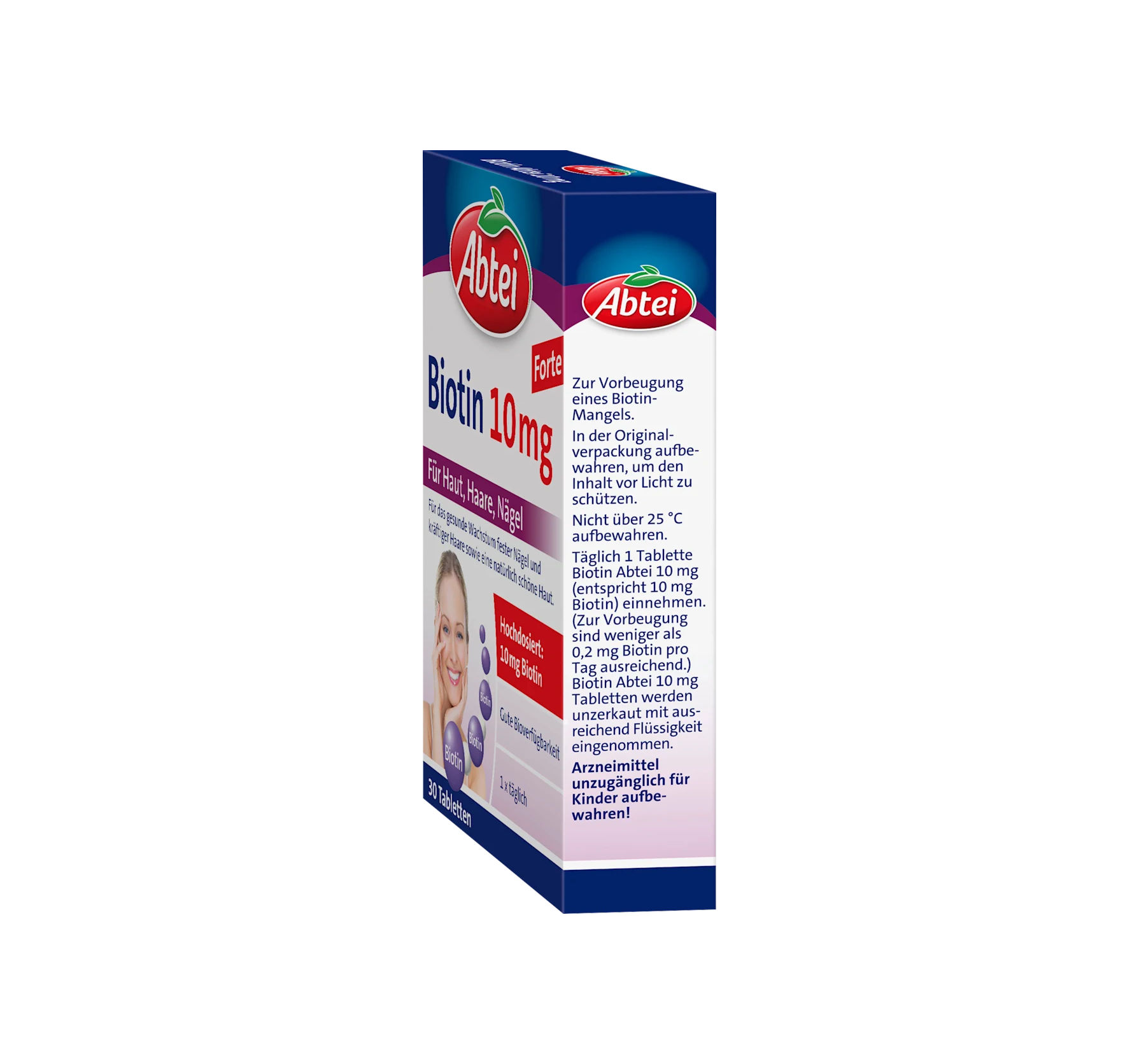 Contains lactose. Read the package insert. For risks and side effects, read the package insert and ask your doctor or pharmacist. Active ingredients: Biotin Areas of application: Biotin Abtei 10 mg is used to prevent biotin deficiency Active ingredient concentration: Biotin 10 mg Dosage form: Tablets Exact product name: Biotin Abtei 10 mg. Store in the original packaging to protect from light. Do not store above 25°C! Keep out of the reach and sight of children.