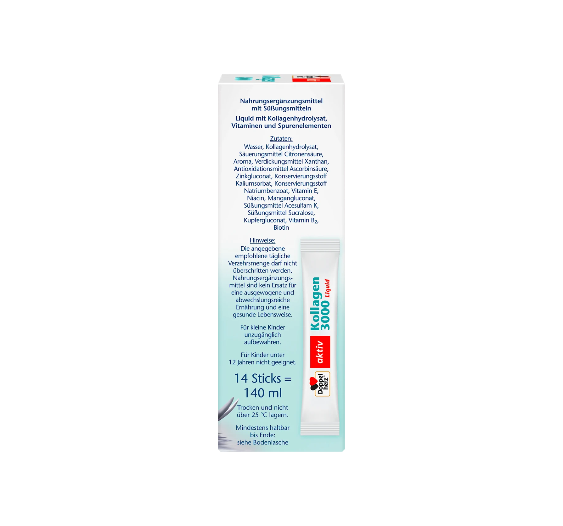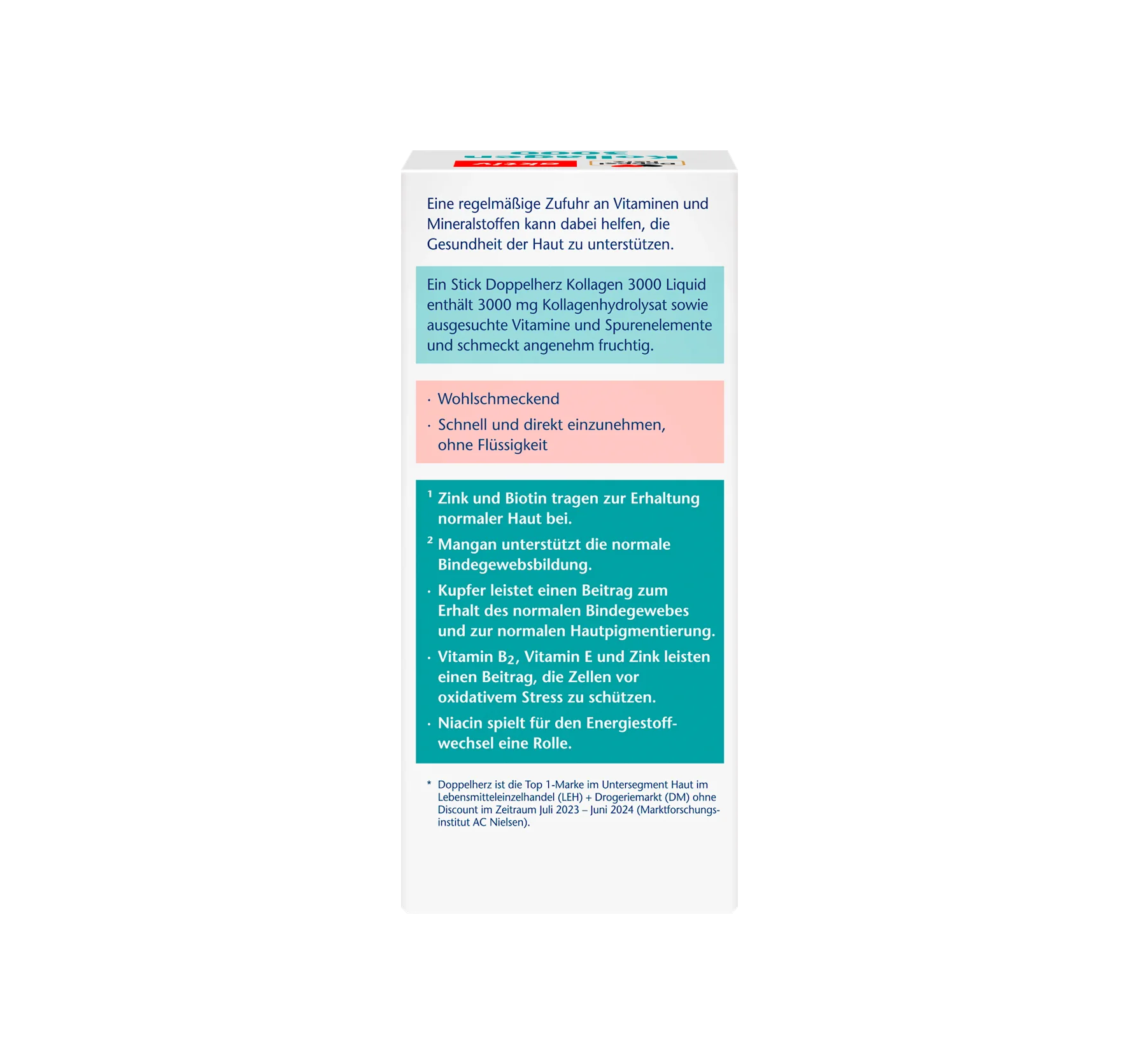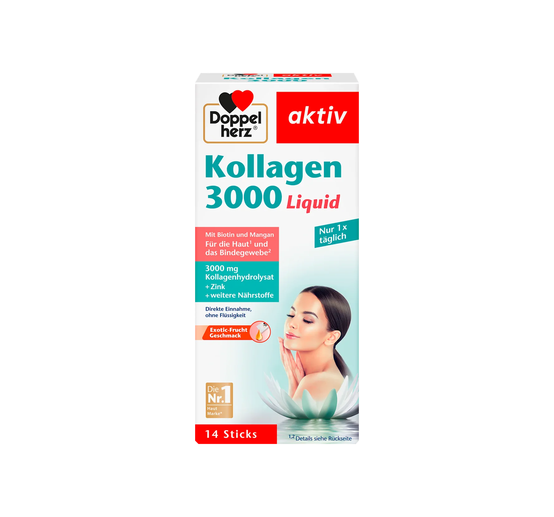 Doppelherz Collagen 3,000 Liquid Sticks contain vitamin A, biotin, and zinc to support normal skin. Manganese also contributes to normal connective tissue formation. The sticks have an exotic fr...
