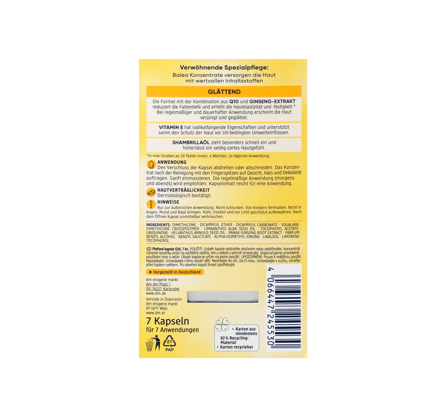 Pampering special care with active ingredients: Balea Q10 Anti-Wrinkle Concentrate with Q10 and ginseng extract reduces the depth of wrinkles and increases skin elasticity and firmness.* With re...