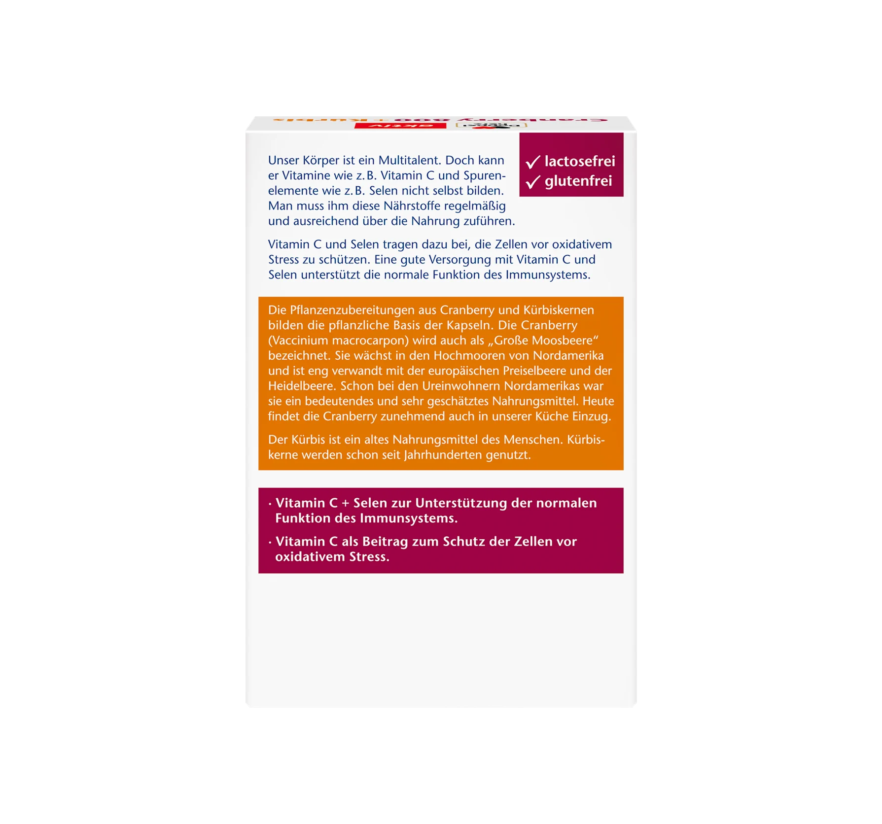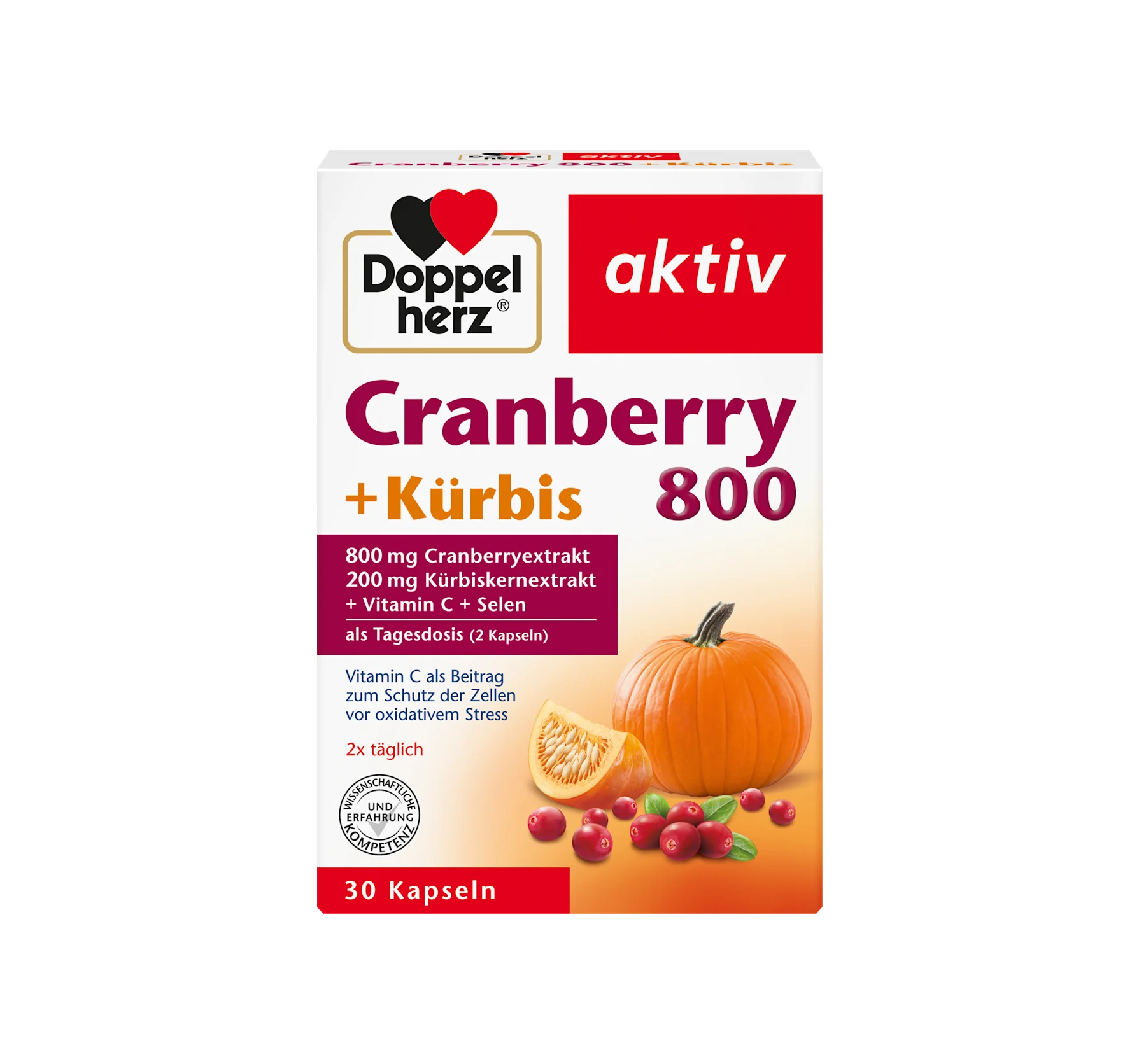 Plant preparations made from cranberries and pumpkin seeds form the plant-based basis of Doppelherz's Cranberry + Pumpkin + Vitamin C + Selenium capsules. Vitamin C and selenium support the norm...