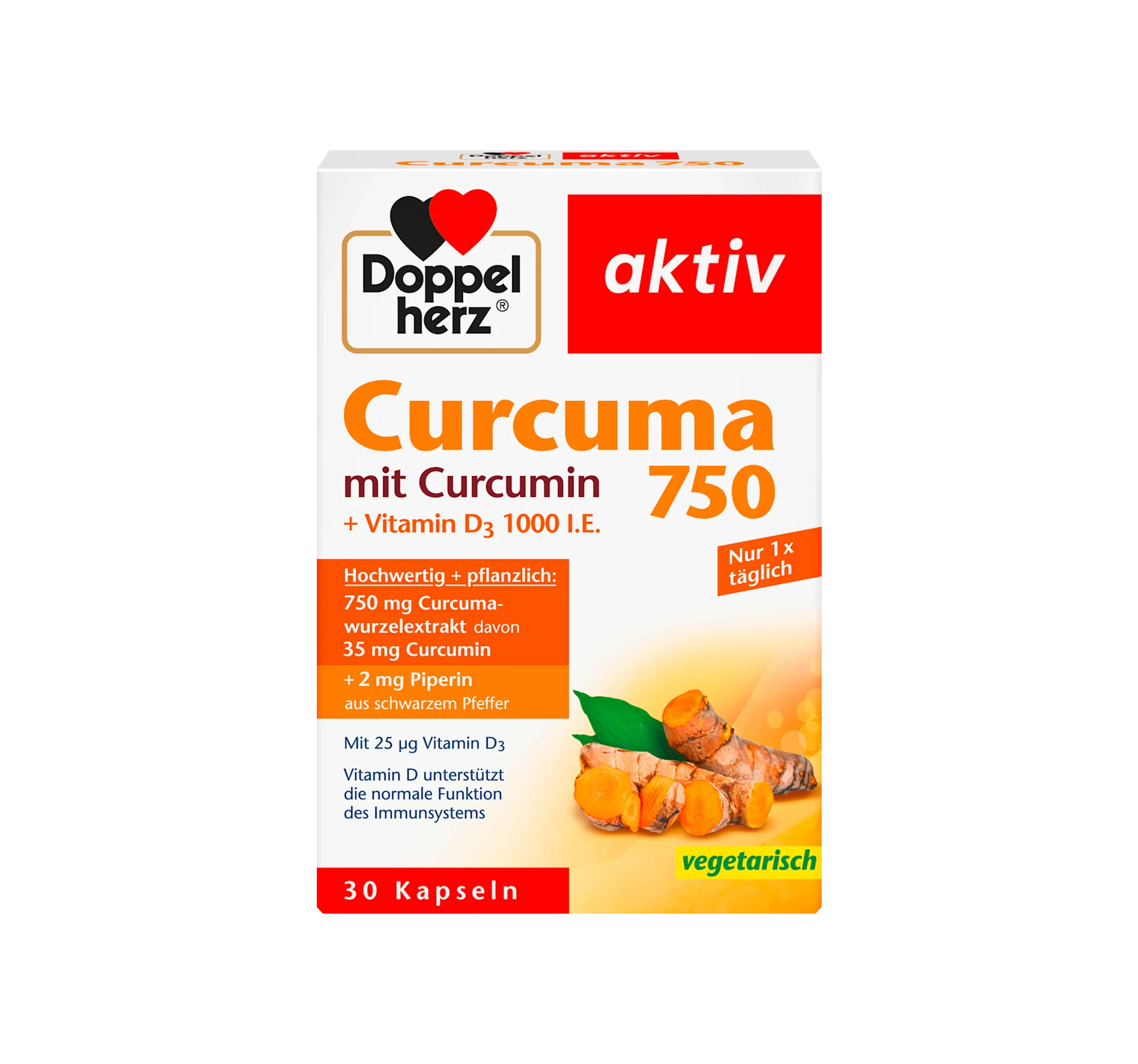 Doppelherz Curcuma 750 capsules contain 750 mg of high-quality curcuma root extract (from Curcuma longa L.) with a natural curcumin content of 35 mg, combined with 2 mg of piperine and 25 μg of ...