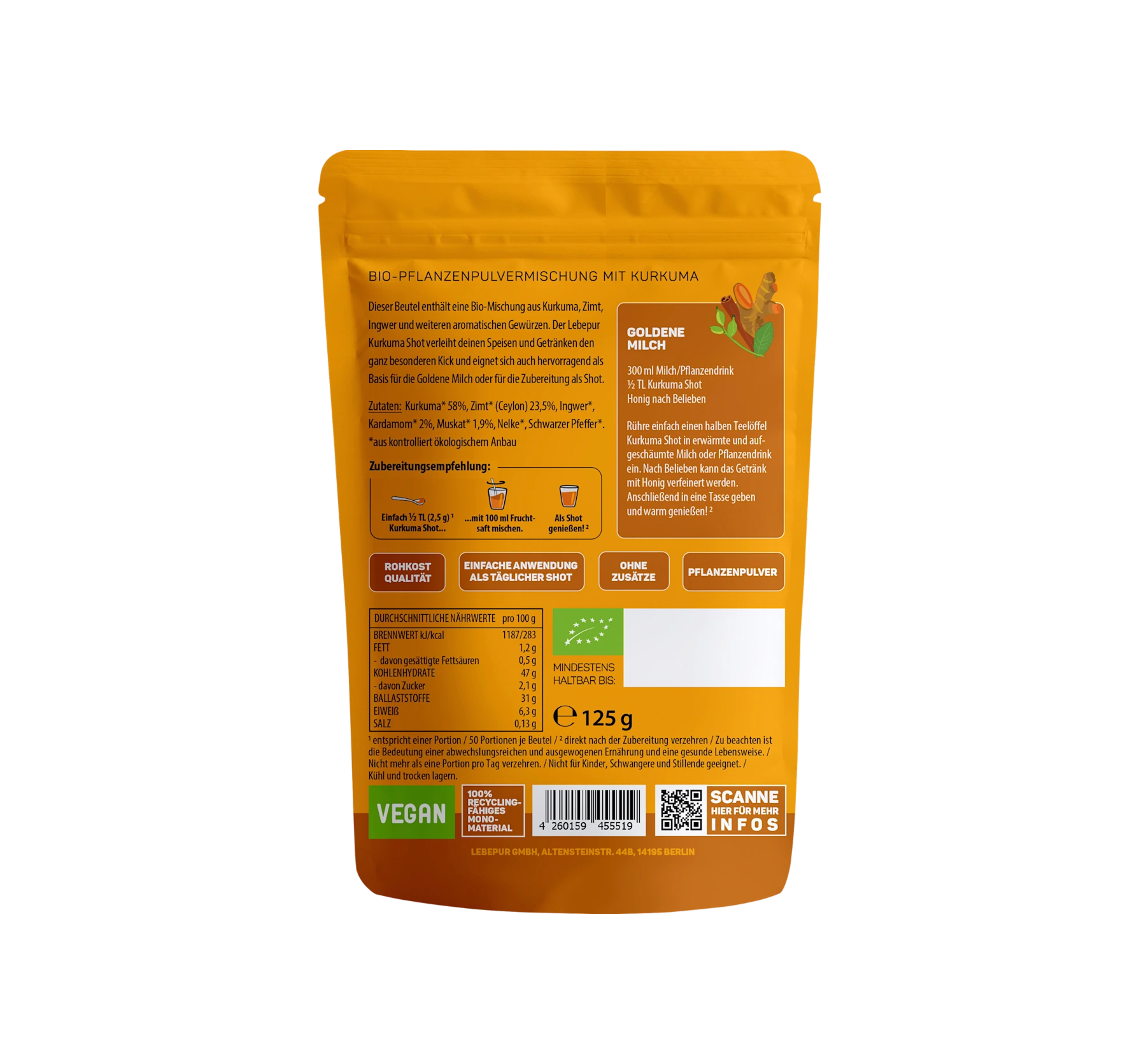The Lebepur Superfood Powder Turmeric Shot is ideal as an ingredient in delicious green smoothies. Just 1 to 2 teaspoons are enough to quickly and easily enhance your smoothie. This gently dried...