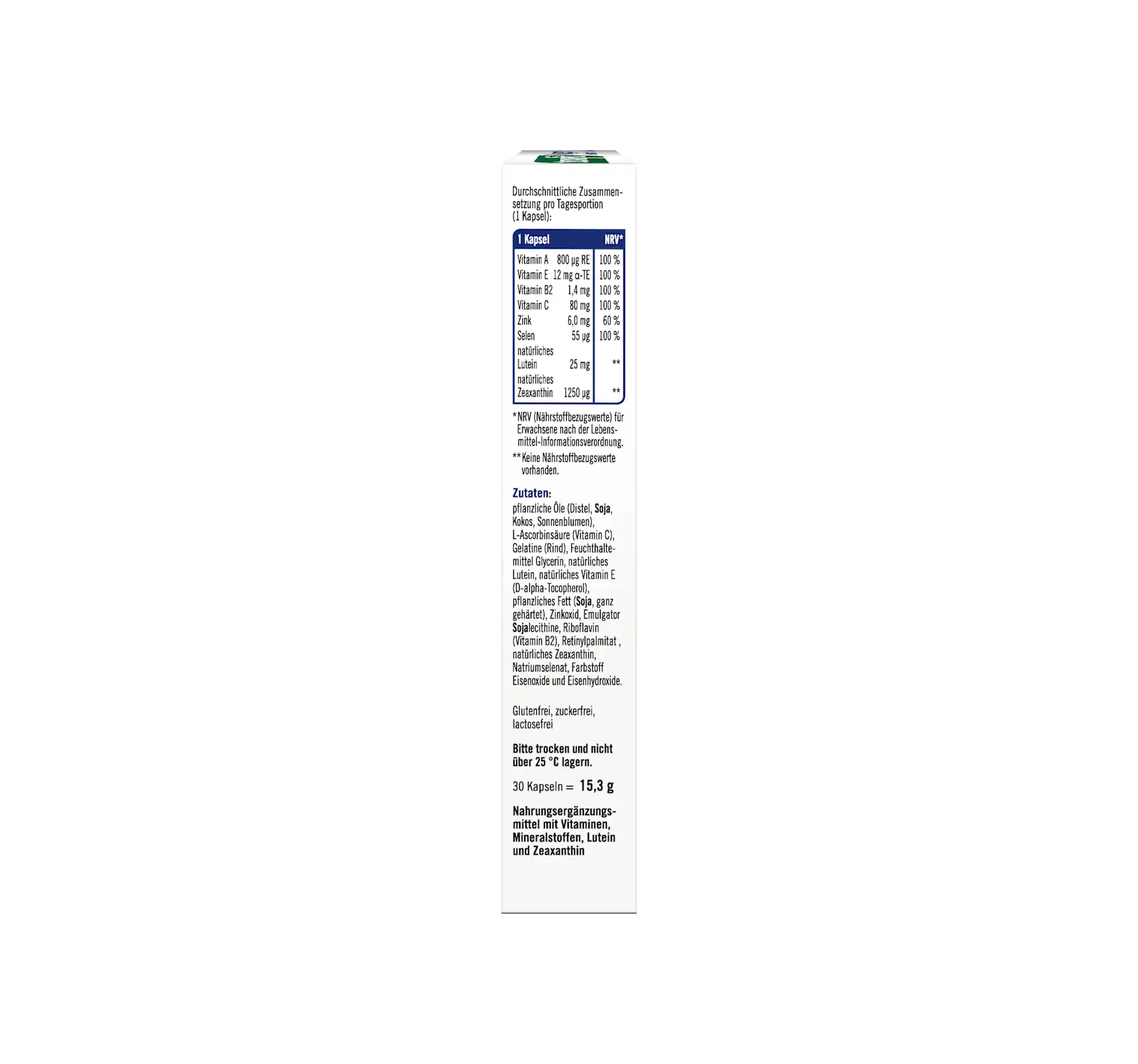 EXACT PRODUCT NAME: DIETARY SUPPLEMENT WITH VITAMINS, MINERALS, LUTEIN, AND ZEAXANTHIN. INGREDIENTS: VEGETABLE OILS (SAFFLOWER, SOY, COCONUT, SUNFLOWER), L-ASCORBIC ACID (VITAMIN C), GELATIN (BEEF), HUMECTANT GLYCERIN, NATURAL LUTEIN, NATURAL VITAMIN E (D-ALPHA-TOCOPHEROL), VEGETABLE FAT (FULLY HYDROGENATED SOY), ZINC OXIDE, EMULSIFIER SOY LECITHINS, RIBOFLAVIN (VITAMIN B2), RETINYL PALMITATE, NATURAL ZEAXANTHIN, SODIUM SELENATE, COLORING IRON OXIDE AND IRON HYDROXIDE. PLEASE NOTE THE ALLERGEN INFORMATION.