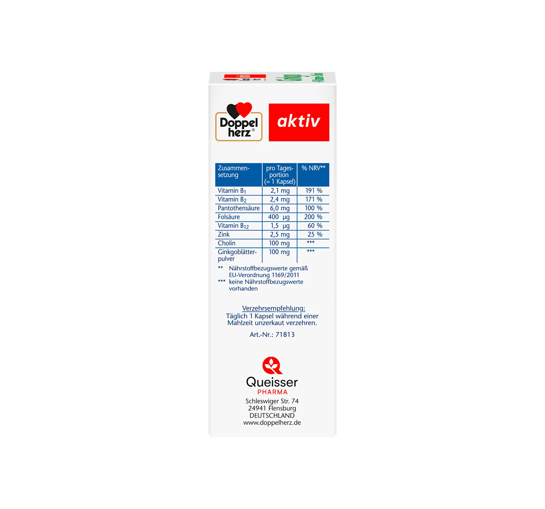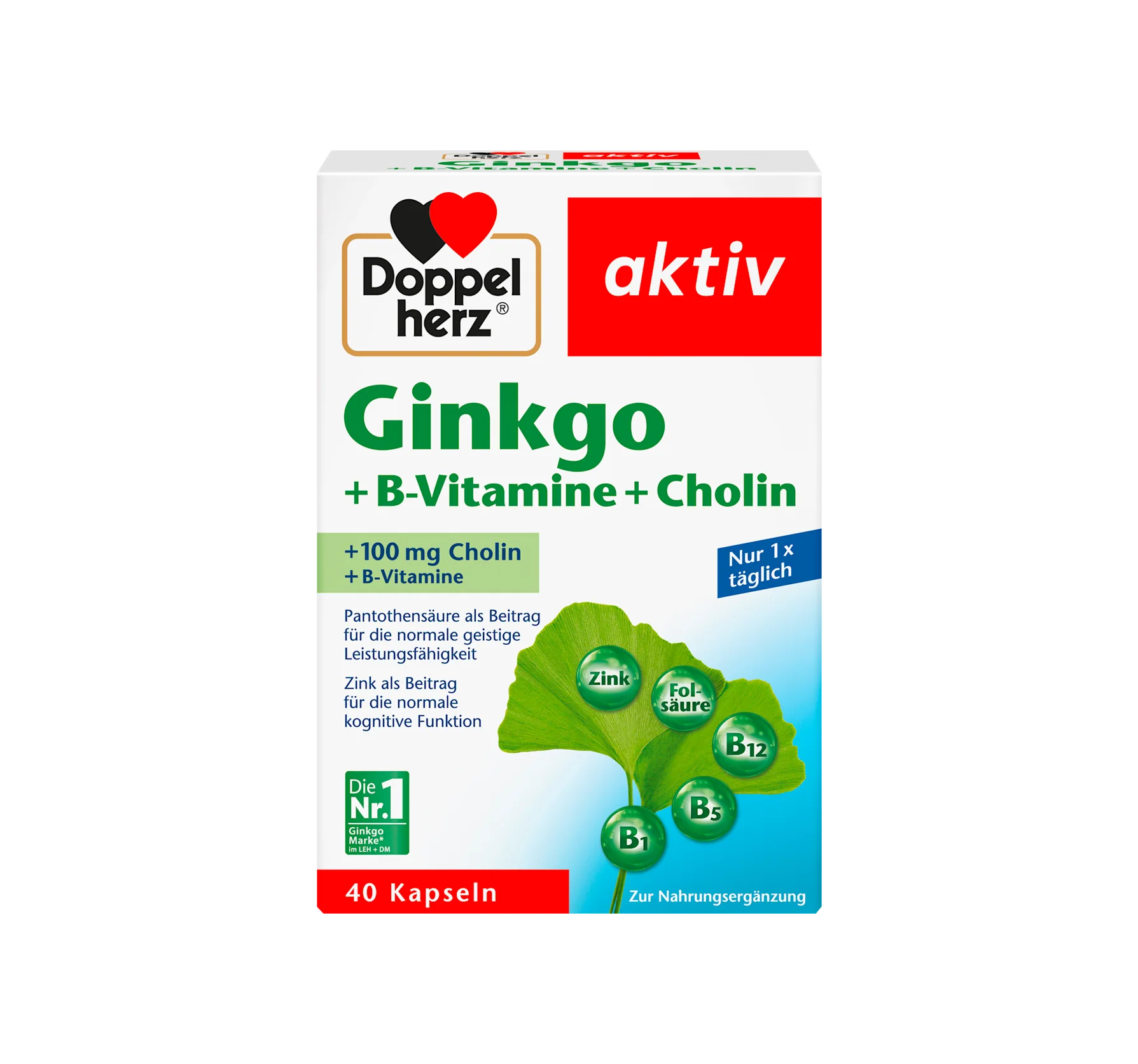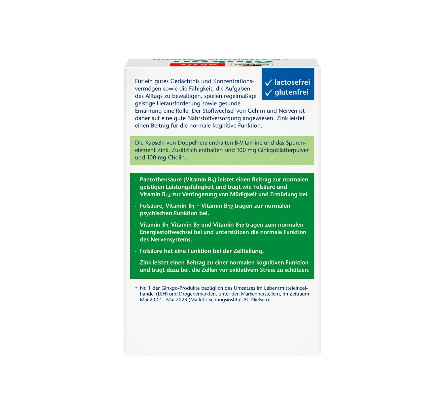 This dietary supplement from Doppelherz contains ginkgo, vitamins, and choline. Pantothenic acid can contribute to normal mental performance, and zinc contributes to normal cognitive performance...