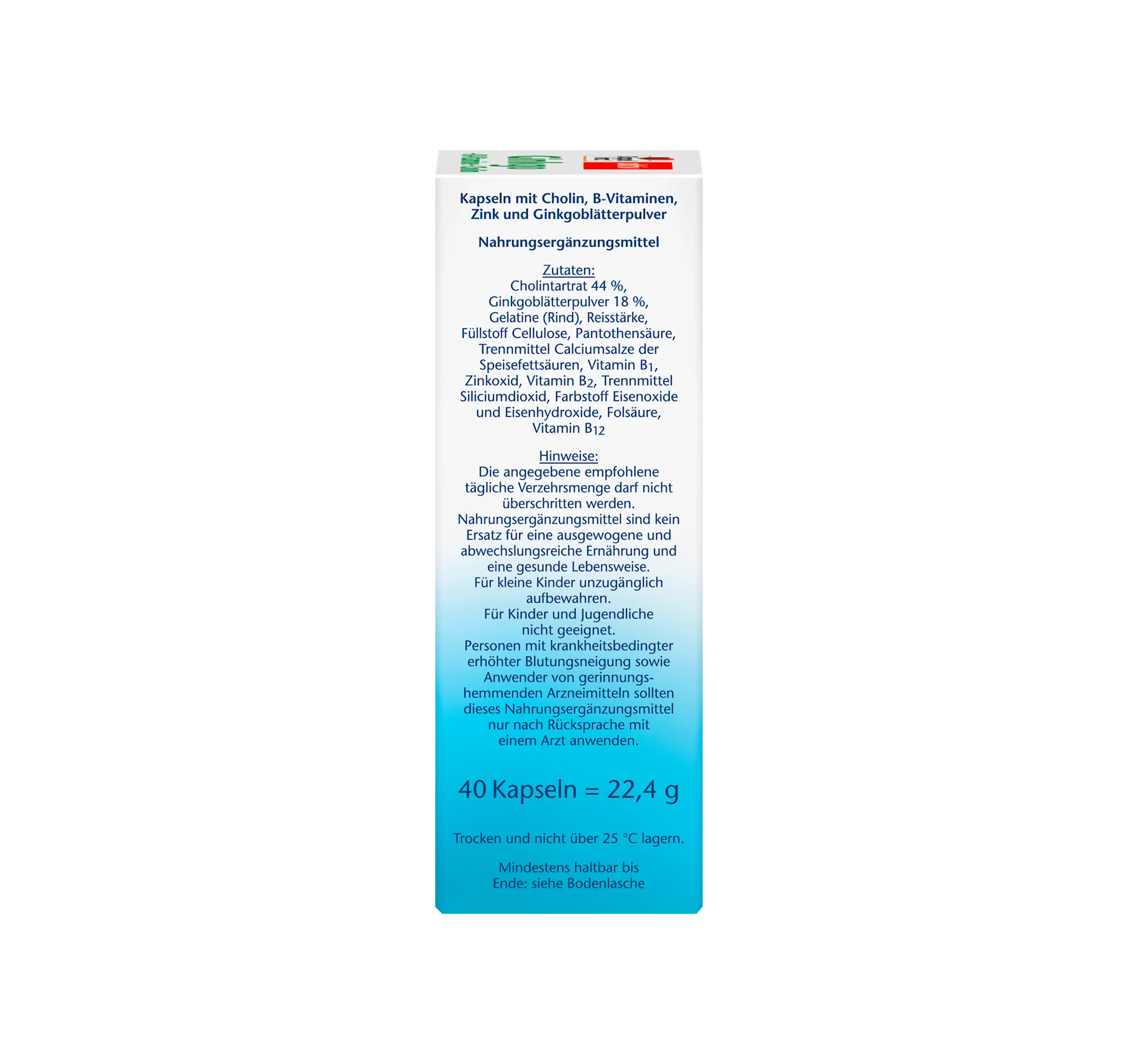 INGREDIENTS: CHOLINE TARTRATE 44%, GINKGO LEAF POWDER 18%, GELATIN (BEEF), RICE STARCH, FILLER CELLULOSE, PANTOTHENIC ACID, ANTI-CAKING AGENT CALCIUM SALTS OF FATTY ACIDS, VITAMIN B1, ZINC OXIDE, VITAMIN B2, ANTI-CAKING AGENT SILICON DIOXIDE, COLOR IRON OXIDES AND IRON HYDROXIDES, FOLIC ACID, VITAMIN B12. PLEASE NOTE THE INFORMATION ON ALLERGENS.