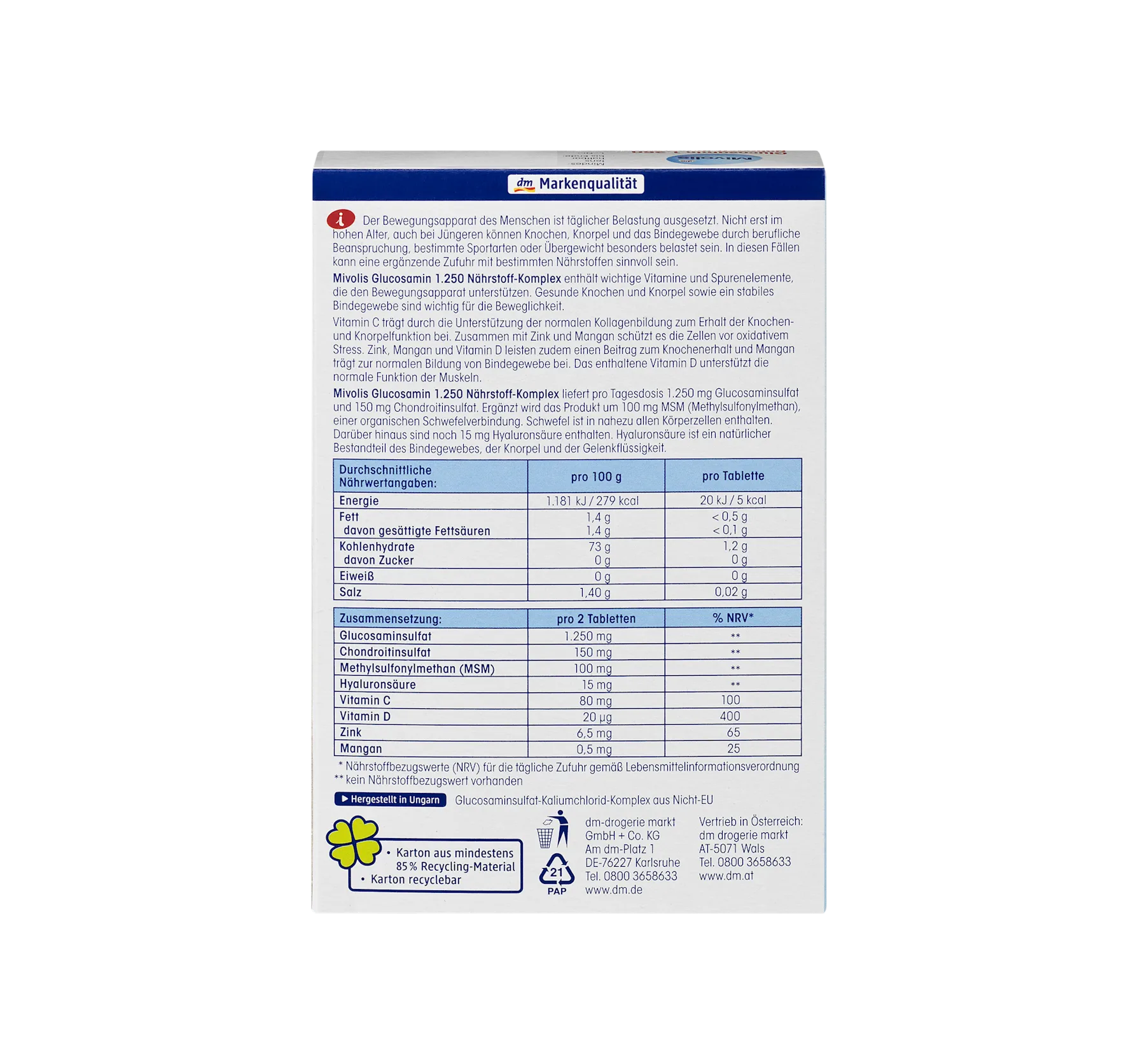 Take 2 tablets daily with liquid (e.g., ½ glass of water). Do not exceed the stated recommended daily intake. Consumers being treated with coumarin anticoagulants should only use this product after consulting a doctor, as glucosamine can increase the anticoagulant effect of the medication. Consumers with known diabetes mellitus should have their blood sugar levels monitored, as interactions with glucose metabolism may occur. No data are available for pregnant or breastfeeding women, children, or adolescents; therefore, these groups of people should refrain from use. Do not exceed the stated recommended daily intake. Do not take other food supplements containing zinc. Food supplements are not a substitute for a varied and balanced diet and a healthy lifestyle.