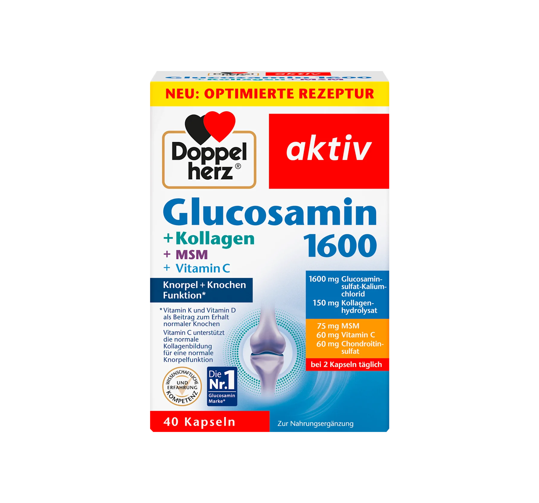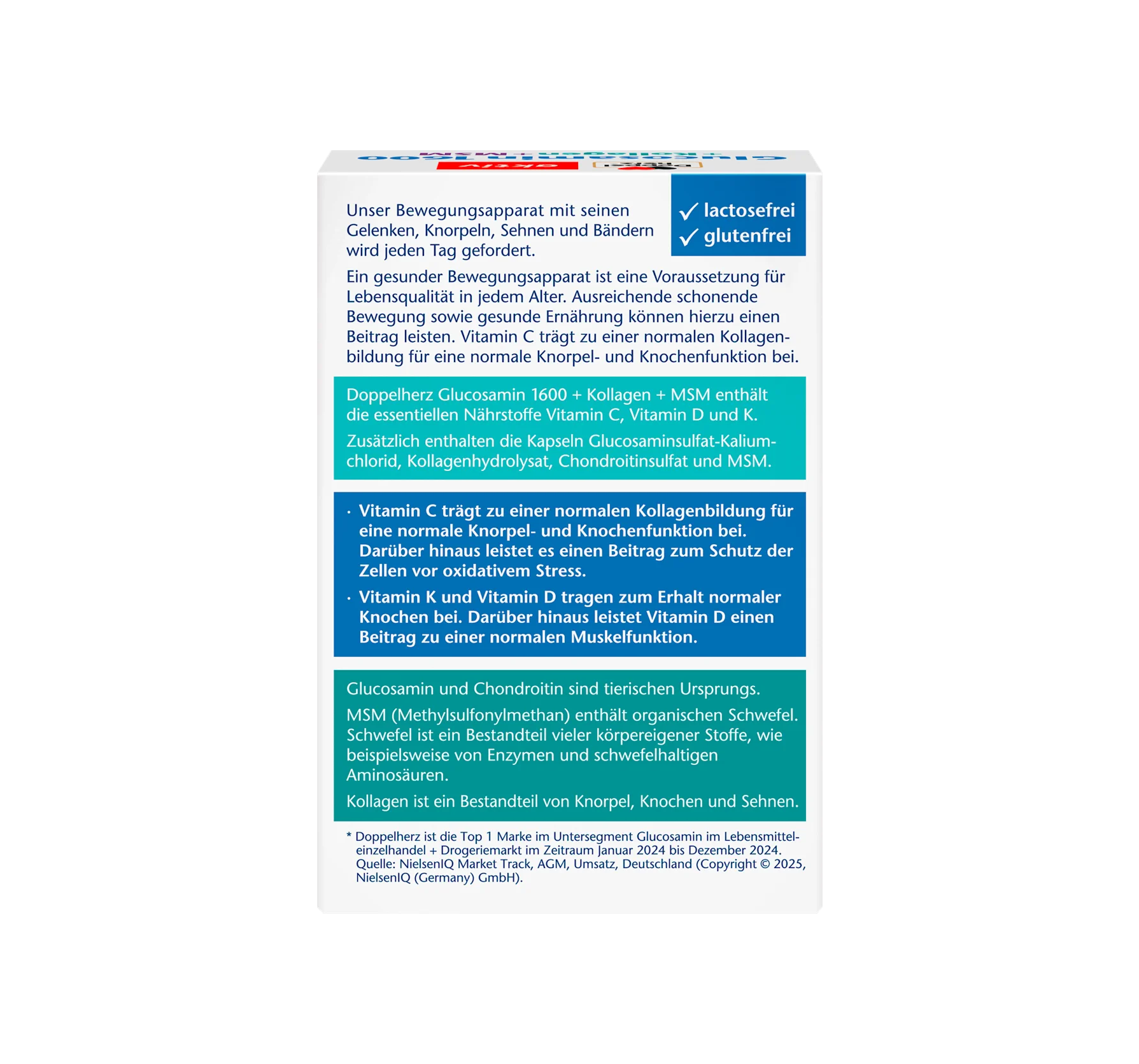 The Glucosamine 1600 Collagen MSM Vitamin C capsules from Doppelherz contain vitamins C, D, and K, as well as collagen, MSM, and glucosamine. Vitamin C contributes to normal collagen formation f...