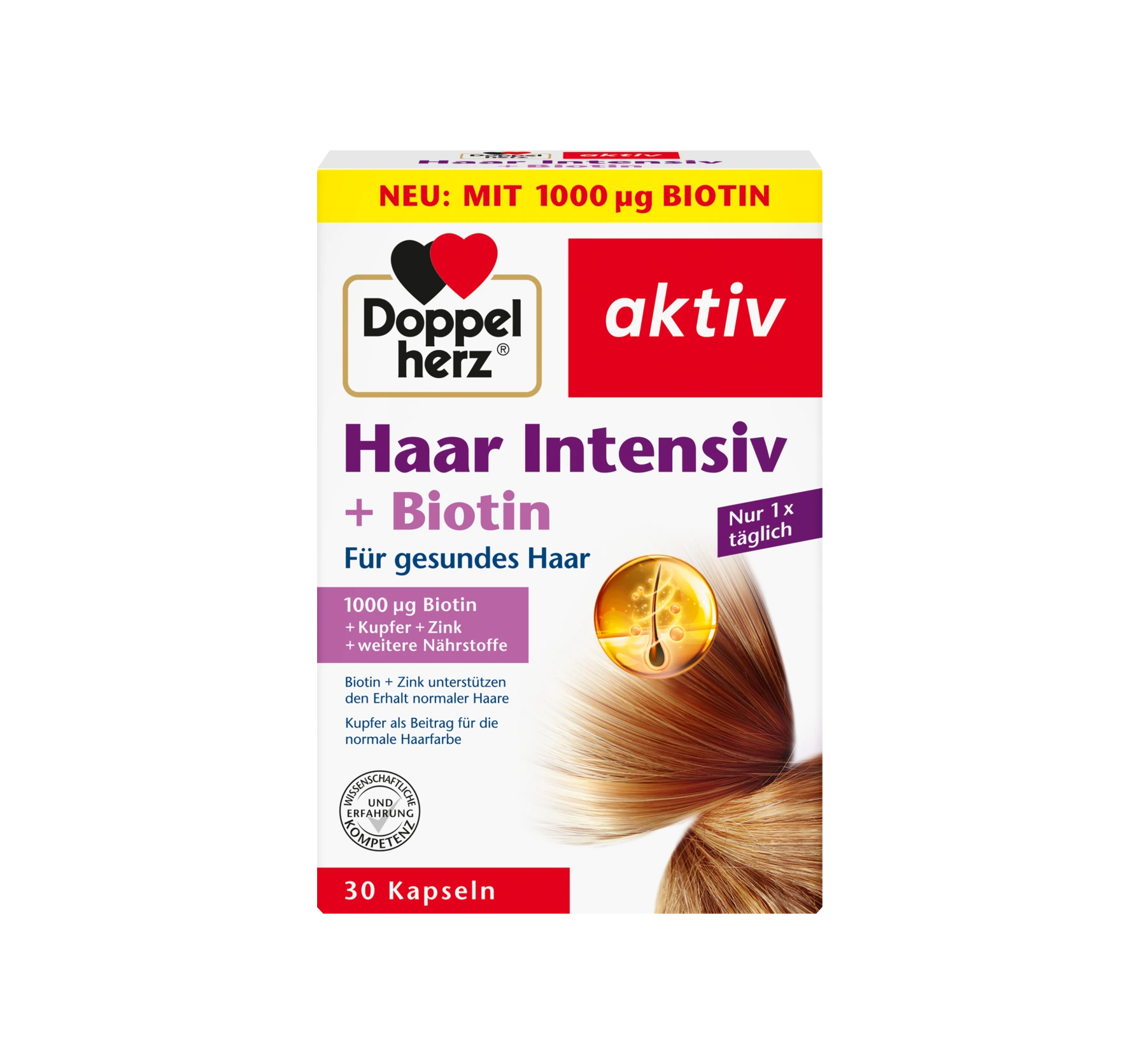 In addition to proper hair care and a healthy diet, Doppelherz's Hair Intensive + Biotin can help keep your hair healthy. Biotin and zinc contribute to maintaining normal hair. Copper can help m...