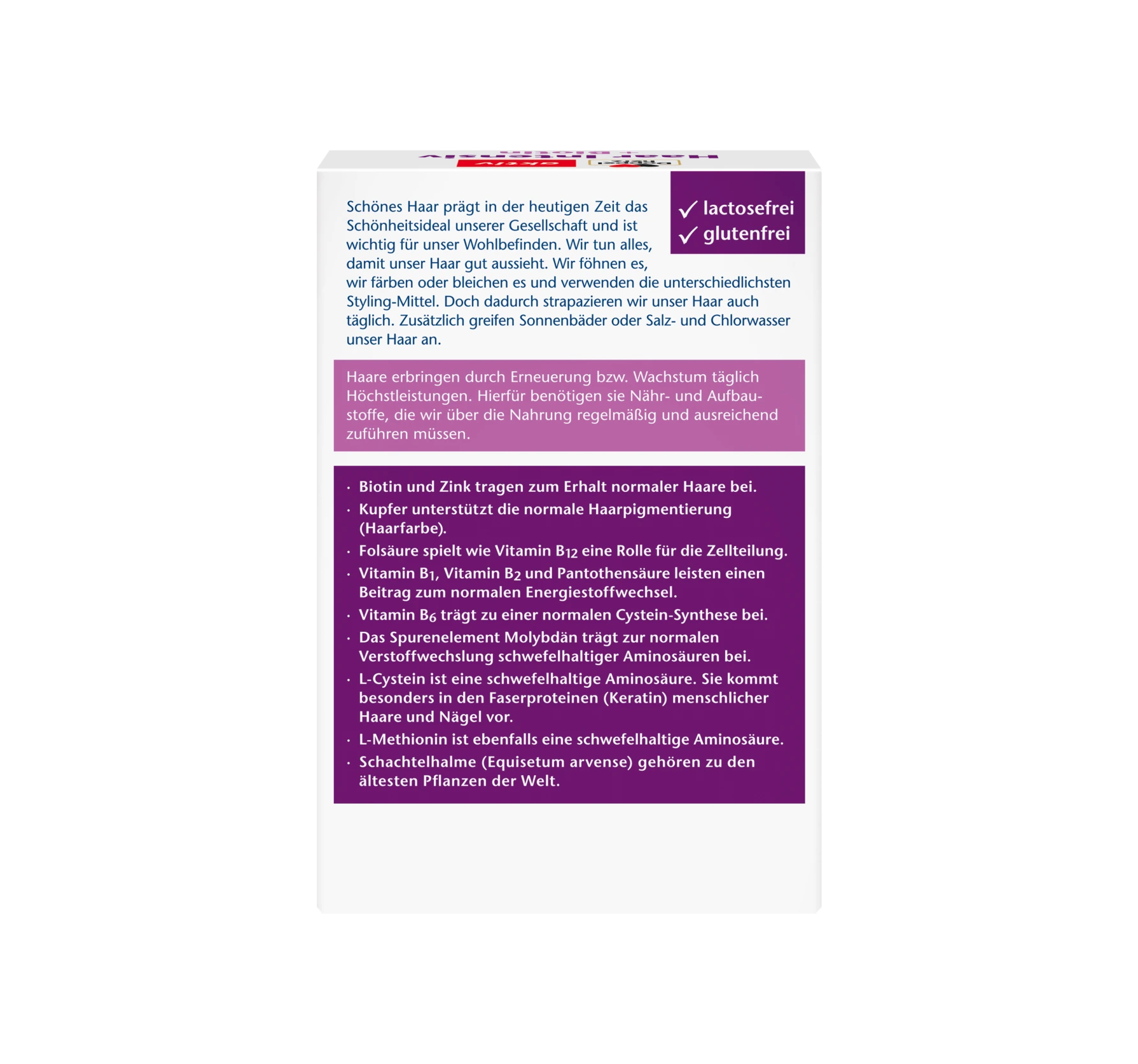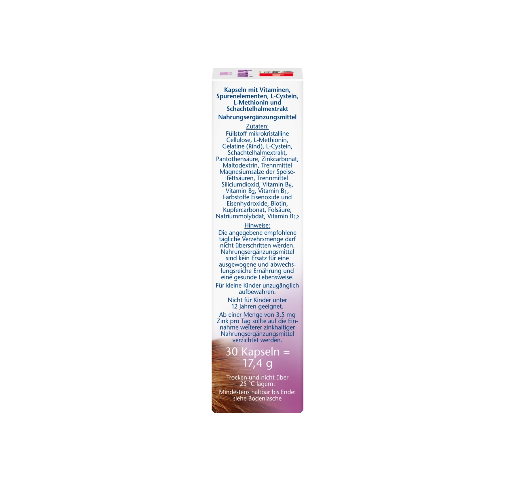 EXACT PRODUCT NAME: FOOD SUPPLEMENT, CAPSULES WITH VITAMINS, TRACE ELEMENTS, L-CYSTEINE, L-METHIONINE AND HORSETAIL EXTRACT INGREDIENTS: BULKING AGENT MICROCRYSTALLINE CELLULOSE, L-METHIONINE, GELATIN (BEEF), L-CYSTEINE, HORSETAIL EXTRACT, PANTOTHENIC ACID, ZINC CARBONATE, MALTODEXTRIN, ANTI-CAKING AGENT MAGNESIUM SALTS OF FATTY ACIDS, ANTI-CAKING AGENT SILICON DIOXIDE, VITAMIN B6, VITAMIN B2, VITAMIN B1, COLORINGS IRON OXIDES AND IRON HYDROXIDES, BIOTIN, COPPER CARBONATE, FOLIC ACID, SODIUM MOLYBDATE, VITAMIN B12 PLEASE NOTE THE INFORMATION ON ALLERGENS.