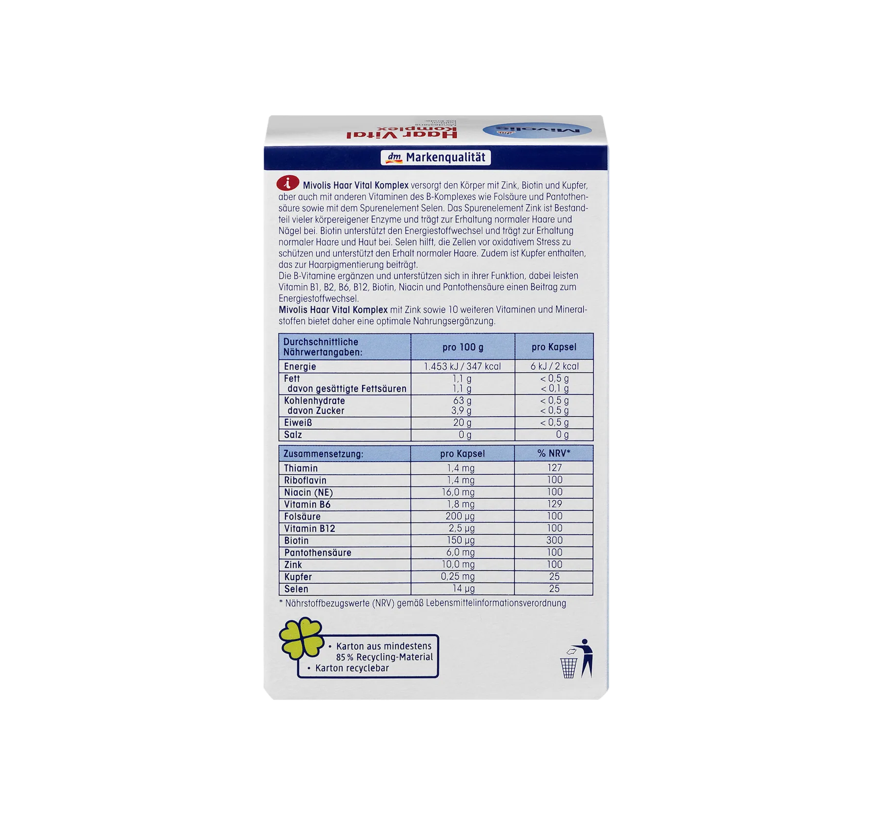 Mivolis Hair Vital Complex supplies the body with zinc, biotin, and copper, as well as other B vitamins such as folic acid and pantothenic acid, and the trace element selenium. The trace element...