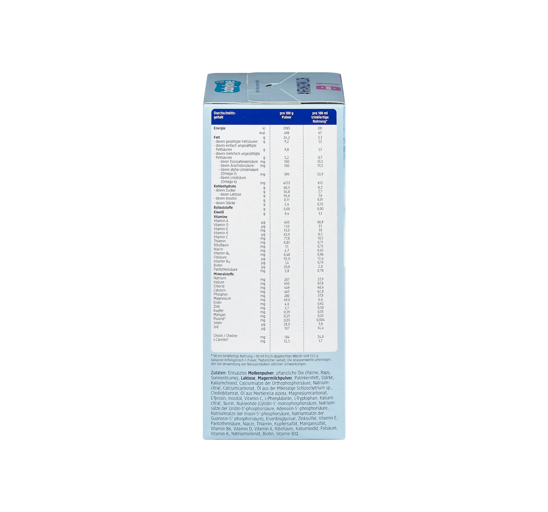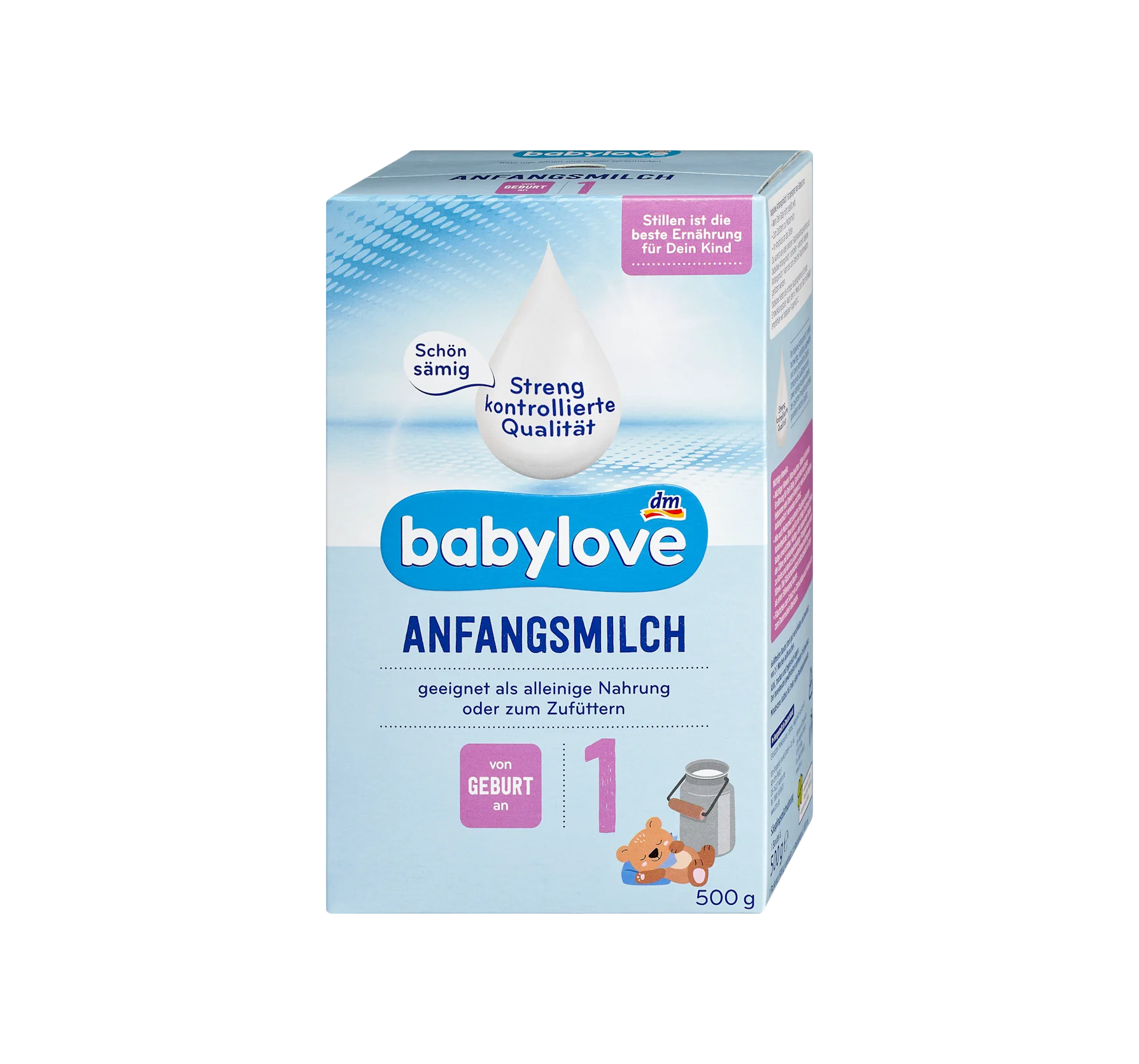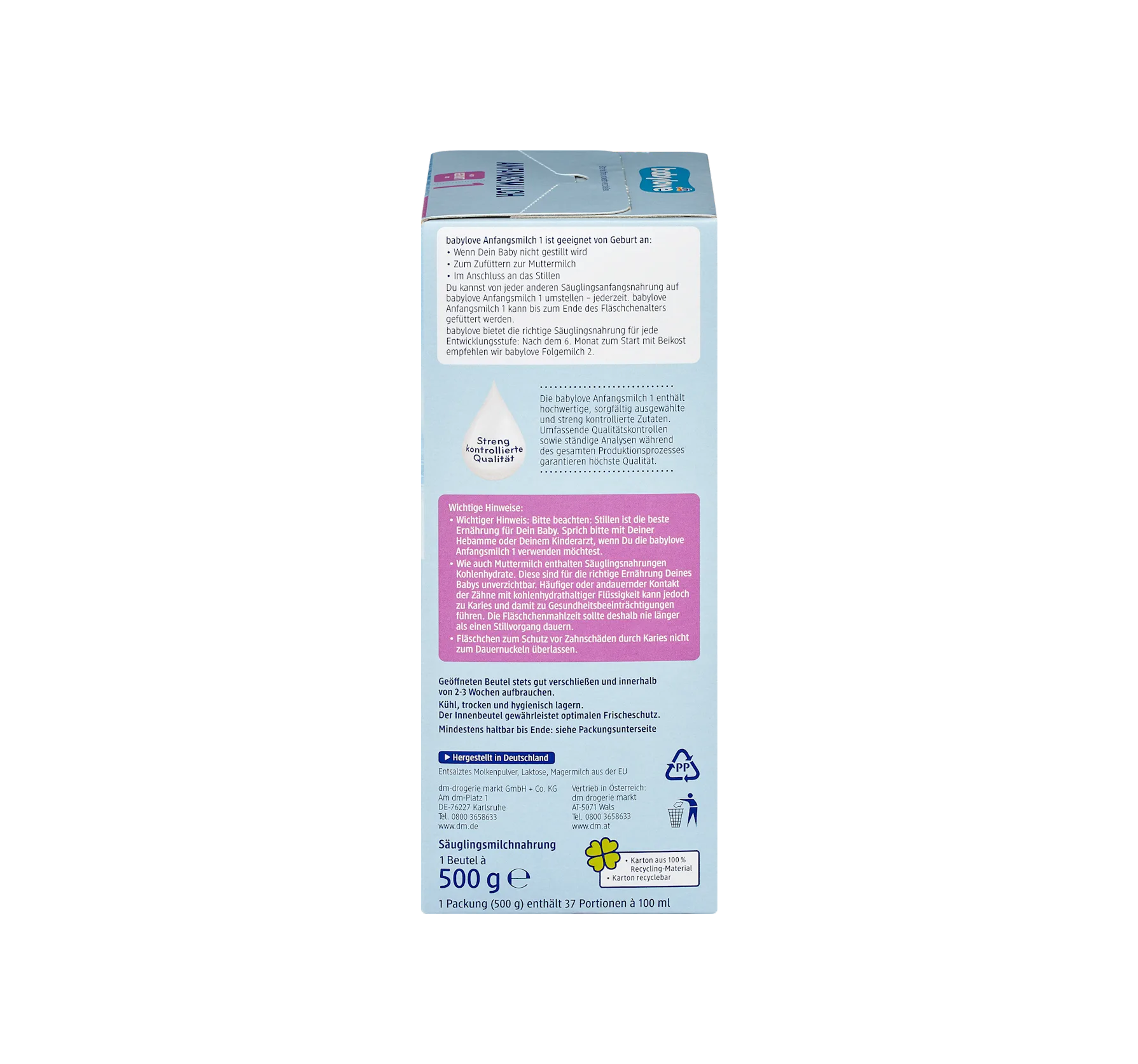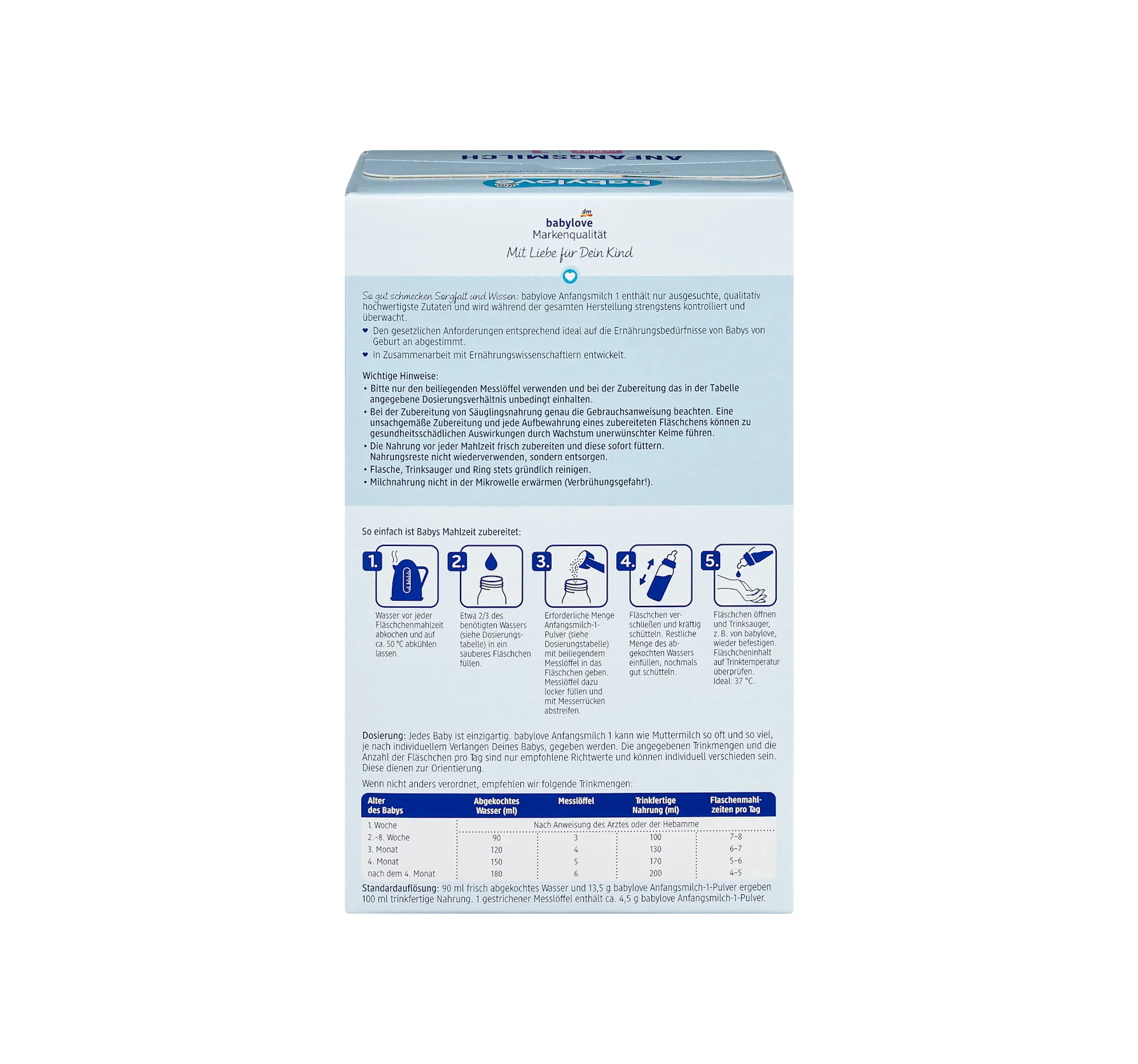 IMPORTANT INFORMATION: *PLEASE ONLY USE THE ENCLOSED SPOON AND STRICTLY ADHERE TO THE DOSAGE RATIO INDICATED IN THE TABLE. *WHEN PREPARING INFANT FOOD, CAREFULLY FOLLOW THE INSTRUCTIONS FOR USE. IMPROPER PREPARATION AND ANY STORAGE OF A PREPARED BOTTLE CAN LEAD TO HARMFUL HEALTH EFFECTS DUE TO THE GROWTH OF UNWANTED GERMS. *PREPARE FOOD FRESHLY BEFORE EACH MEAL AND FEED IMMEDIATELY. DO NOT REUSE ANY UNUSED FOOD. DISCARD IT. *ALWAYS CLEAN THE BOTTLE, TEA AND RING THOROUGHLY. *DO NOT HEAT FOOD IN THE MICROWAVE (RISK OF SCALDING!). babylove Initial Milk 1 is suitable from birth: *If your baby is not breastfed *As a supplement to breast milk *After breastfeeding You can switch from any other infant formula to babylove Initial Milk 1 – at any time. babylove Initial Milk 1 can be fed until the end of the bottle-feeding age. babylove offers the right infant formula for every developmental stage: After the 6th month, when starting complementary foods, we recommend babylove Follow-on Milk 2. babylove Initial Milk 1 contains high-quality, carefully selected and strictly controlled ingredients. Comprehensive quality controls and constant analysis throughout the entire production process guarantee the highest quality. Preparing your baby's meal is so easy: 1. Boil water before each bottle feed and allow to cool to approximately 50°C. 2. Pour approximately 2/3 of the required water (see dosage table) into a clean bottle. 3. Use the enclosed measuring spoon to add the required amount of Infant Milk 1 powder (see dosage table) to the bottle. Loosely fill the measuring spoon and level off with the back of a knife. 4. Close the bottle and shake vigorously. Pour in the remaining boiled water and shake well again. 5. Open the bottle and reattach the teat, e.g. from babylove. Check the contents of the bottle for drinking temperature. Ideal: 37°C. Dosage: Every baby is unique. Babylove Infant Milk 1, like breast milk, can be given as often and as much as your baby requires, depending on their individual needs. The stated amounts and the number of bottles per day are only recommended guidelines and may vary from person to person. These are intended as a guide only. Standard solution: 90 ml of freshly boiled water and 13.5 g of babylove First Infant Milk Powder yield 100 ml of ready-to-drink formula. 1 level scoop contains approximately 4.5 g of babylove First Infant Milk Powder.