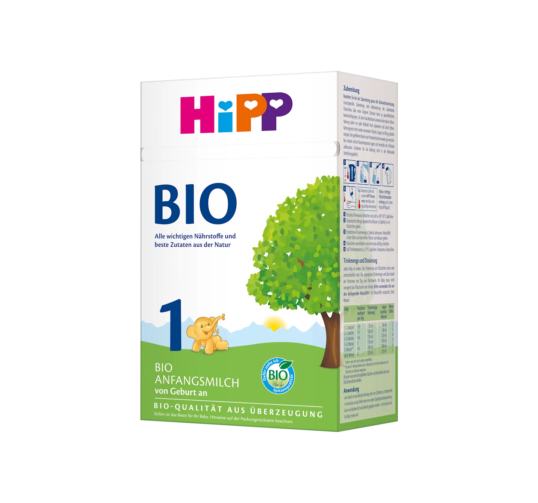 Use: -From birth as a sole food or as a supplement to breast milk -Following breastfeeding or another infant formula -Can be given like breast milk as needed – as often and as much as your baby wants. This product left our factory in perfect condition – please ensure that the packaging is intact before use. Makes 46 bottles of 100 ml each. Best before: see bottom of pack when unopened. When preparing, follow the instructions carefully. Improper preparation and storage of prepared food can lead to health problems, e.g., due to the growth of unwanted germs. Therefore, prepare food fresh before each feeding and feed immediately. Do not reuse leftover food. Clean the bottle, teat, and ring thoroughly. Do not heat the food in the microwave (risk of scalding). 1. Boil fresh drinking water and cool to approx. 40-50°C. 2. Pour the desired amount of boiled water (see table) into a bottle. 3. Measure the recommended amount of powder (see table). Loosely fill the measuring spoon and level off. Add the powder to the water. 4. Close the bottle and shake vigorously several times. 5. Cool to drinking temperature (approx. 37°C). Check the temperature. Amount to be fed and dosage: Every baby is different. The amount fed per bottle can vary greatly. The amounts fed and the number of portions per day are guidelines only. Your baby does not necessarily have to drink the bottle empty. Please only use the enclosed measuring spoon. You need 30 ml of water for one measuring spoon. Age: 1st-2nd week*, 7-8 bottle feeds per day, 60 ml boiled water + 2 measuring spoons of powder = 70 ml ready-to-drink food Age: 3rd-4th week, 5-7 bottle feeds per day, 90 ml boiled water + 3 measuring spoons of powder = 100 ml ready-to-drink food Age: 5th-8th week, 5-6 bottle feeds per day, 120 ml boiled water + 4 measuring spoons of powder = 135 ml ready-to-drink food Age: 3rd-4th week Month, 5 bottle feeds per day, 150 ml boiled water + 5 measuring spoons of powder = 170 ml ready-to-drink food Age: 5 months~, 4-5 bottle feeds per day, 180 ml boiled water + 6 measuring spoons of powder = 200 ml ready-to-drink food Age: from 6 months, 4 bottle feeds per day, 210 ml boiled water + 7 measuring spoons of powder = 235 ml ready-to-drink food *Unless otherwise recommended by a doctor. ~From the 5th month, you can start complementary foods in consultation with your pediatrician or midwife. With each new and fully introduced complementary food meal, one bottle feed should be omitted.
