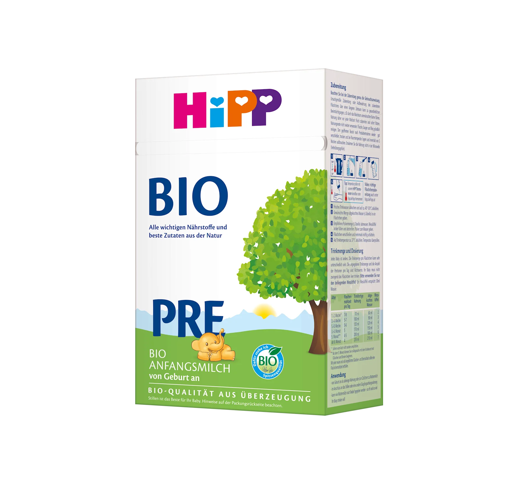 Use: From birth as the sole food or as a supplement to breast milk Following breastfeeding or other infant formula Can be given like breast milk as needed - as often and as much as your baby wants to drink This product left our premises in perfect condition - please check that the packaging is intact before use. Preparation Please follow the instructions carefully when preparing the food. Improper preparation and storage of the prepared food can lead to health problems, e.g. due to the growth of unwanted germs. Therefore, prepare food fresh before each meal and feed immediately. Do not reuse leftover food. Clean the bottle, teat and ring thoroughly. Do not heat the food in the microwave (risk of scalding). (1) Boil fresh drinking water and cool to approx. 40 - 50°C. (2) Pour the desired amount of boiled water (see table) into a bottle. (3) Measure the recommended amount of powder (see table). Loosely fill the measuring spoon and level off. Add the powder to the water. (4) Close the bottle and shake vigorously several times. (5) Cool to drinking temperature (approx. 37°C). Check the temperature. Amount to be drunk and dosage: Every baby is different. The amount drunk per bottle can vary greatly. The amounts drunk and the number of portions per day are guidelines only. Your baby does not have to drink the entire bottle. Please only use the measuring spoon provided. You need 30 ml of water for one measuring spoon of powder. 1 level measuring spoon = approx. 4.20 g HiPP PRE BIO Age: 1st-2nd week*, 7-8 bottle feeds per day, 60 ml boiled water + 2 measuring spoons of powder = 70 ml ready-to-drink food. Age: 3rd-4th week, 5-7 bottle feeds per day, 90 ml boiled water + 3 measuring spoons of powder = 100 ml ready-to-drink food Age: 5th-8th week, 5-6 bottle feeds per day, 120 ml boiled water + 4 measuring spoons of powder = 135 ml ready-to-drink food Age: 3rd-4th week Month, 5 bottle feeds per day, 150 ml boiled water + 5 scoops of powder = 170 ml ready-to-drink formula Age: 5 months**, 4-5 bottle feeds per day, 180 ml boiled water + 6 scoops of powder = 200 ml ready-to-drink formula Age: from 6 months, 4 bottle feeds per day, 210 ml boiled water + 7 scoops of powder = 235 ml ready-to-drink formula *Unless otherwise recommended by a doctor. **From the 5th month, you can start complementary feeding in consultation with your pediatrician or midwife. With each new and fully introduced complementary feeding, one bottle feed should be omitted. Makes 47 100ml bottles