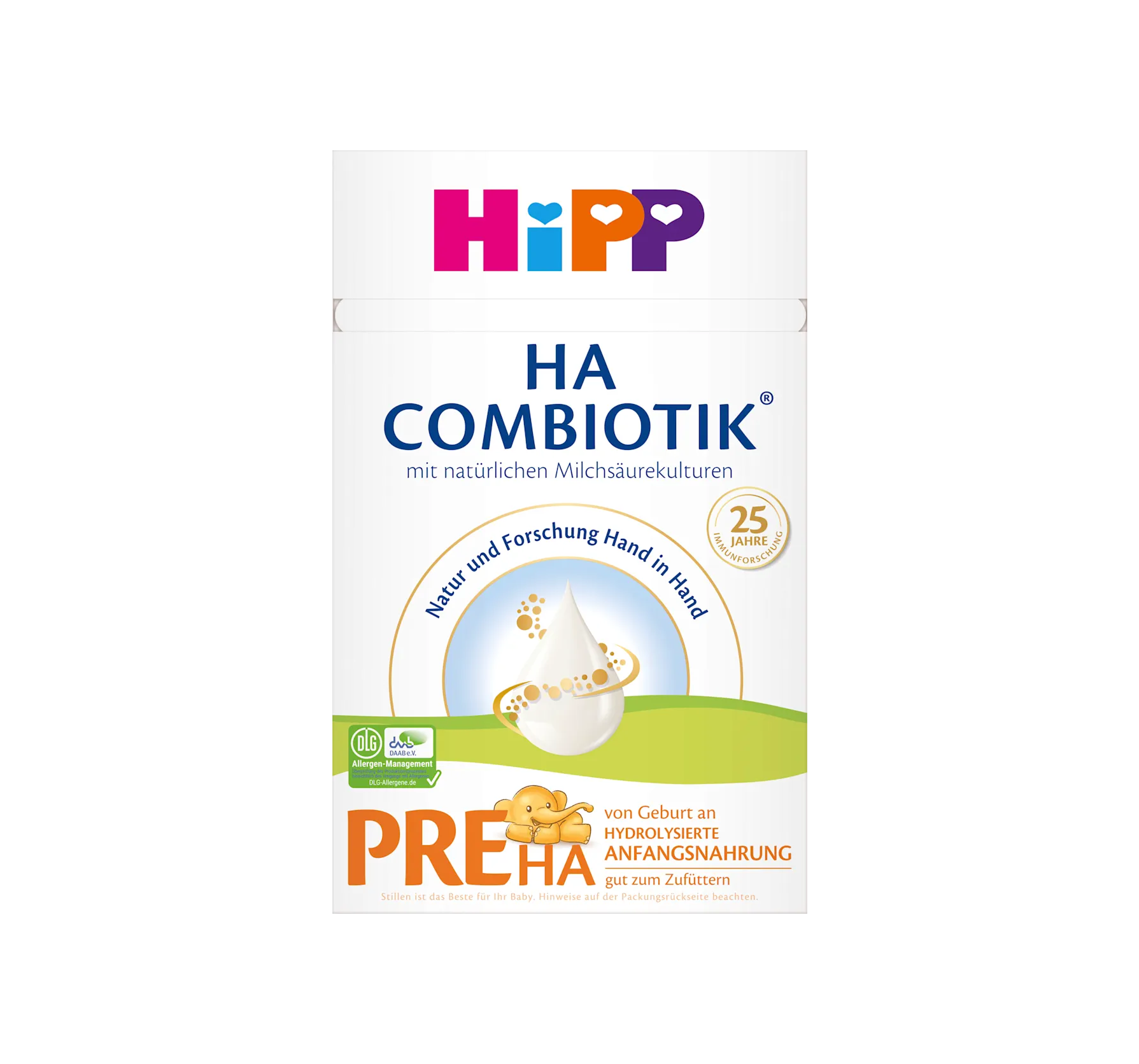 Use: From birth as a sole food or as a supplement to breast milk Following breastfeeding or any other hydrolyzed infant formula Can be given like breast milk as needed – as often and as much as your baby wants to drink This product left our premises in perfect condition – please check that the packaging is intact before use. When preparing the food, please follow the instructions carefully. Improper preparation and storage of the prepared food can lead to health problems, e.g., due to the growth of unwanted germs. Therefore, prepare food fresh before each meal and feed immediately. Do not reuse leftover food. Clean the bottle, teat, and ring thoroughly. Do not heat the food in the microwave (risk of scalding). (1) Boil fresh drinking water and cool to approx. 40 - 50°C*. (2) Pour the desired amount of boiled water (see table) into a bottle. (3) Measure the recommended amount of powder (see table). Loosely fill the measuring spoon and level off. Add the powder to the water. (4) Close the bottle and shake vigorously several times. (5) Cool to drinking temperature (approx. 37°C). Check the temperature. *To avoid damaging the natural lactic acid cultures, please do not prepare the food with water that is too hot. The powder is subject to natural color variations due to the raw materials. Drinking amount and dosage Every baby is different. The amount drunk per bottle can vary greatly. The stated drinking amount and the number of portions per day are guidelines. Your baby does not necessarily have to drink the entire bottle. Please only use the enclosed measuring spoon! For one measuring spoon of powder you need 30 ml of water. 1 level measuring spoon = approx. 4.3 g HiPP PRE HA COMBIOTIK® Makes 46 bottles of 100 ml each 1st-2nd week*: 7-8 bottle feeds per day, 60 ml boiled water + 2 measuring spoons = 70 ml ready-to-drink food 3rd-4th week: 5-7 bottle feeds per day, 90 ml boiled water + 3 measuring spoons = 100 ml ready-to-drink food 5th-8th week Week: 5-6 bottle feeds per day, 120ml boiled water + 4 measuring spoons = 135ml ready-to-drink formula 3rd-4th month: 5 bottle feeds per day, 150ml boiled water + 5 measuring spoons = 170ml ready-to-drink formula 5th month**: 4-5 bottle feeds per day, 180ml boiled water + 6 measuring spoons = 200ml ready-to-drink formula From 6 months: 4 bottle feeds per day, 210ml boiled water + 7 measuring spoons = 235ml ready-to-drink formula *Unless otherwise recommended by a doctor. **From the 5th month, you can start complementary foods in consultation with your pediatrician or midwife. With each new complementary food introduced, one bottle feed should be omitted.