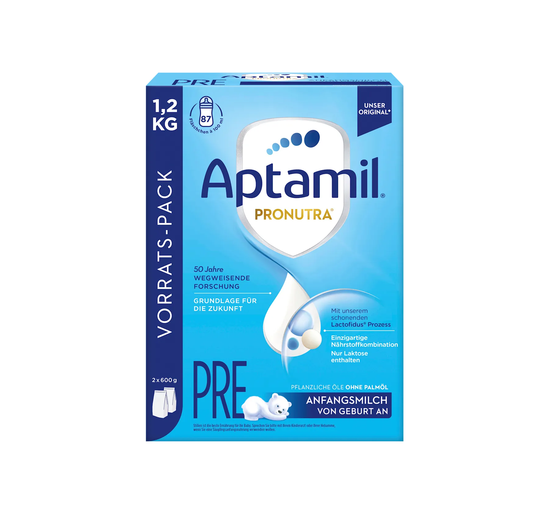 Directions: Aptamil® Pronutra Pre can be given from birth as a sole food or as a supplement. Like breast milk, it can be fed as often and as much as your baby needs. Suitable until the end of bottle feeding. Aptamil® Pronutra First Infant Milk from birth DOSAGE: The number of bottles and amounts to be fed are guidelines and can vary from person to person. 1 scoop of powder requires 30 ml of water. One level scoop contains 4.6 g. PREPARATION: When preparing Aptamil® Pronutra Pre, follow the instructions carefully. Improper preparation and storage can lead to health problems due to the growth of unwanted germs. Prepare the formula fresh before each feeding and feed immediately. Do not reuse leftovers. Clean the bottle, teat, and ring thoroughly. Do not heat formula in the microwave (risk of overheating). 1. Allow fresh, boiled drinking water to cool to approx. 40°C and pour 2/3 of the required amount of water into the bottle. 2. For accurate dosing of the powder, level off the enclosed scoop with the back of a knife. Use only the enclosed scoop. 3. Pour the required amount of powder into the bottle. 4. Close the bottle and shake vigorously vertically for approximately 10 seconds. Pour in the remaining drinking water and shake vigorously again. 5. Open the bottle and attach the teat. Check the contents of the bottle for drinking temperature (approx. 37°C).