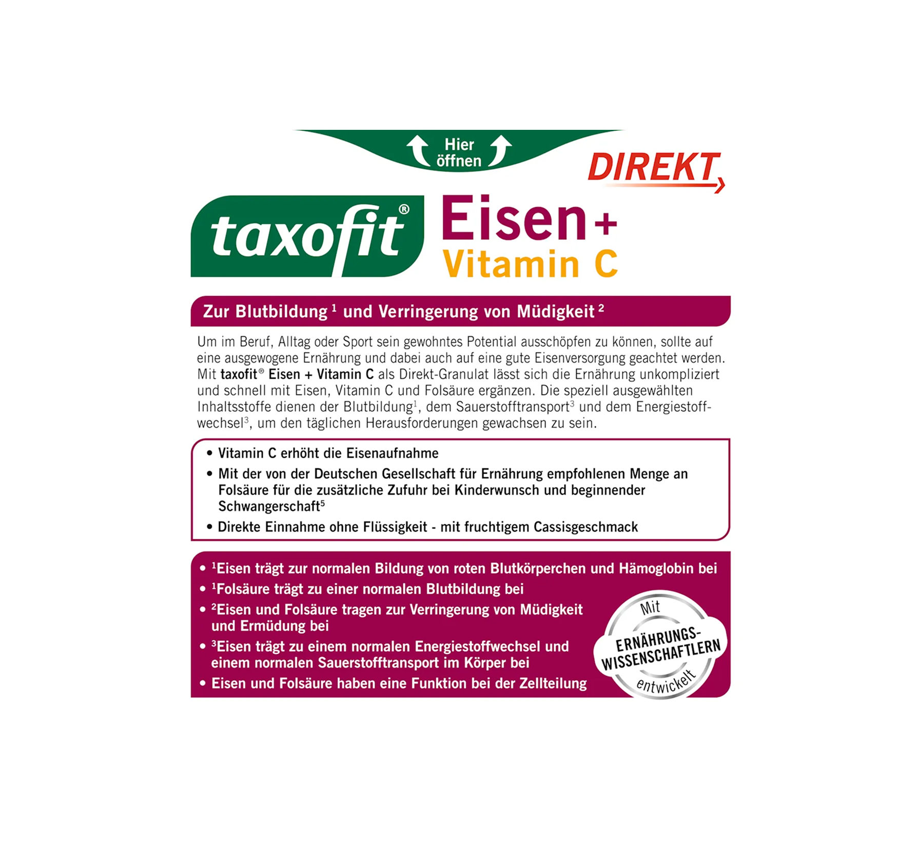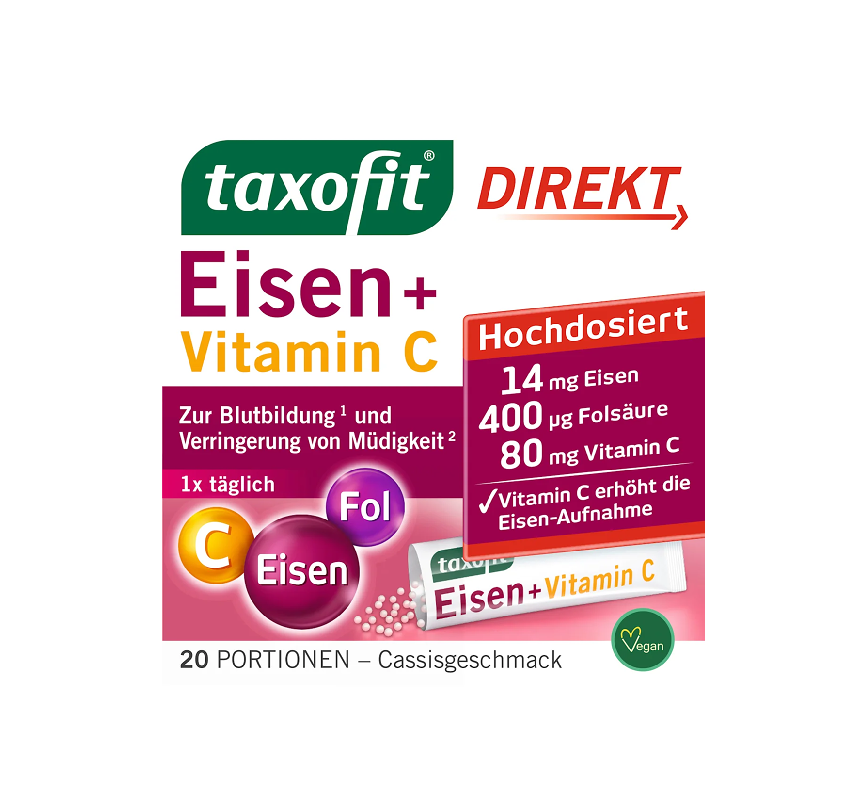 To maximize your potential at work, in everyday life, or during sports, you should eat a balanced diet and ensure you have a good iron supply. With taxofit Iron + Folic Acid in direct granules, ...