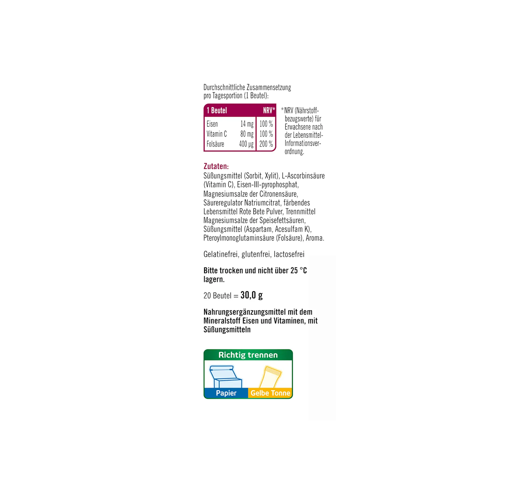 EXACT PRODUCT NAME: FOOD SUPPLEMENT WITH THE MINERAL IRON AND VITAMINS, WITH SWEETENERS. INGREDIENTS: SWEETENERS (SORBITOL, XYLITOL), L-ASCORBIC ACID (VITAMIN C), IRON III PYROPHOSPHATE, MAGNESIUM SALTS OF CITRIC ACID, ACIDITY REGULATOR SODIUM CITRATE, COLORING FOOD BEETROOT POWDER, ANTI-CAKING AGENT MAGNESIUM SALTS OF FATTY ACIDS, SWEETENERS (ASPARTAME, ACESULFAME K), PTEROYLMONOGLUTAMIC ACID (FOLIC ACID), FLAVORING. PLEASE NOTE THE ALLERGEN INFORMATION.