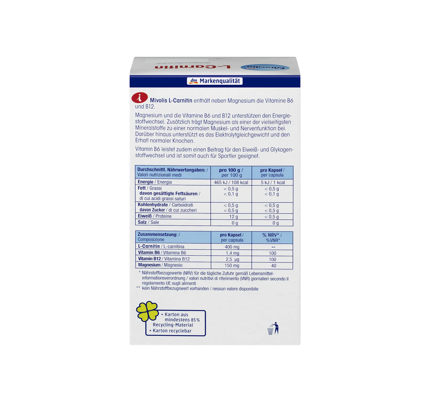 In addition to magnesium, Mivolis L-Carnitine contains vitamins B6 and B12. Magnesium and vitamins B6 and B12 support energy metabolism. Furthermore, magnesium, one of the most versatile mineral...