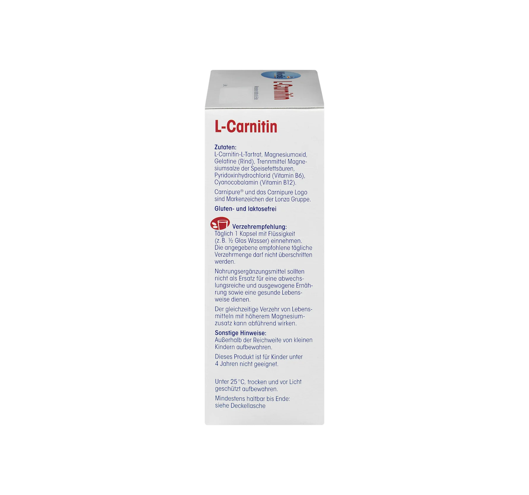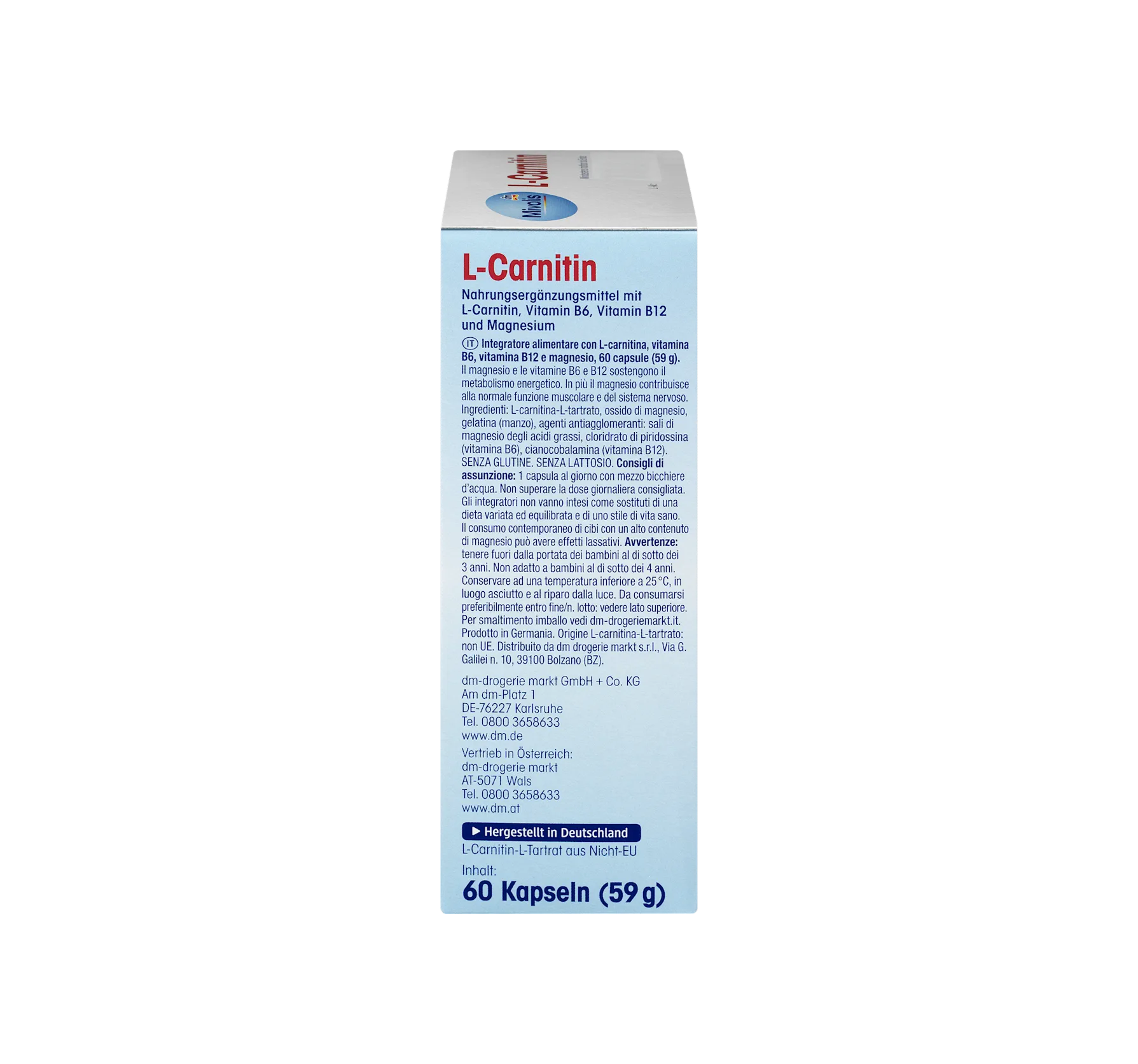 EXACT PRODUCT NAME: FOOD SUPPLEMENT WITH L-CARNITINE, VITAMIN B6, VITAMIN B12 AND MAGNESIUM L-CARNITINE L-TARTRATE | MAGNESIUM OXIDE | GELATIN (BEEF) | ANTI-CAKING AGENT: MAGNESIUM SALTS OF FATTY ACIDS | PYRIDOXINE HYDROCHLORIDE (VITAMIN B6) | CYANOCOBALAMIN (VITAMIN B12).