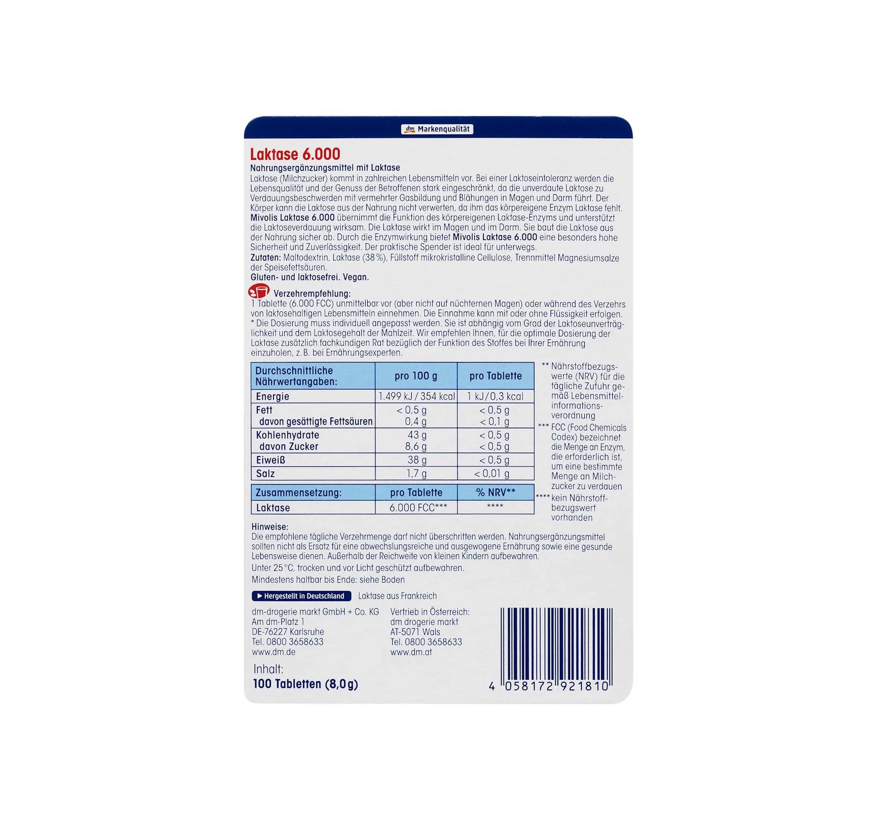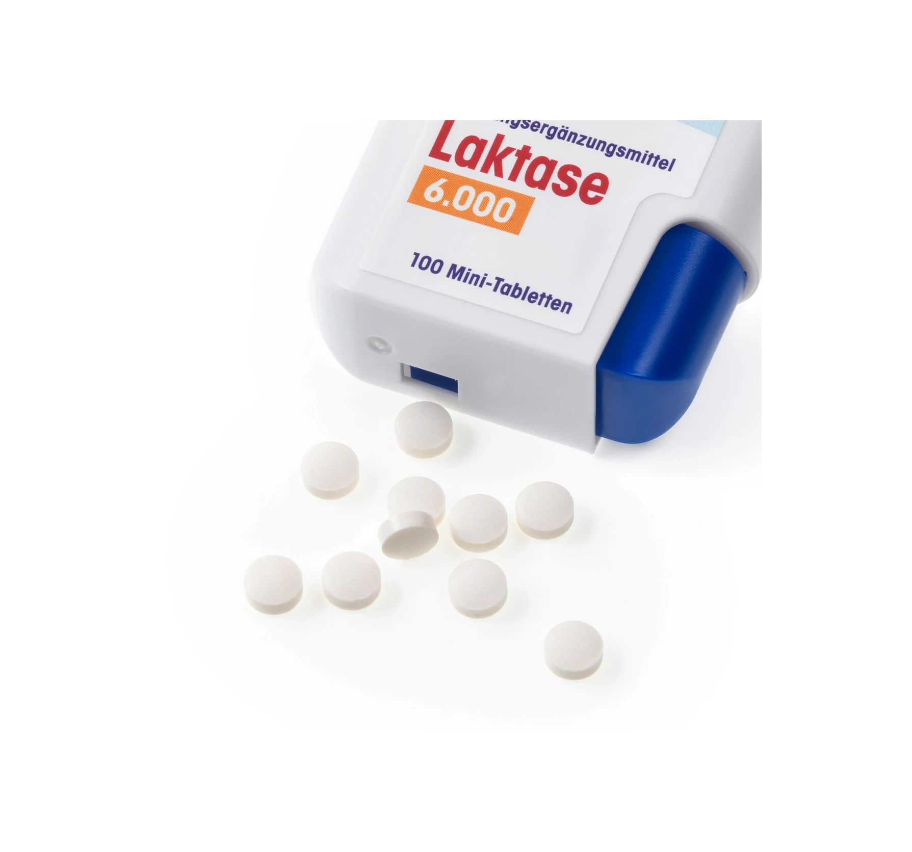 Take 1 tablet (6,000 FCC) immediately before (but not on an empty stomach) or during the consumption of lactose-containing foods. This can be taken with or without liquid. The dosage must be individually adjusted. It depends on the degree of lactose intolerance and the lactose content of the meal. For the optimal dosage of lactase, we recommend that you seek additional expert advice regarding the function of the substance in your diet, e.g., from a nutritionist. The recommended intake must not be exceeded. Food supplements should not be used as a substitute for a varied and balanced diet and a healthy lifestyle. Keep out of the reach of small children.