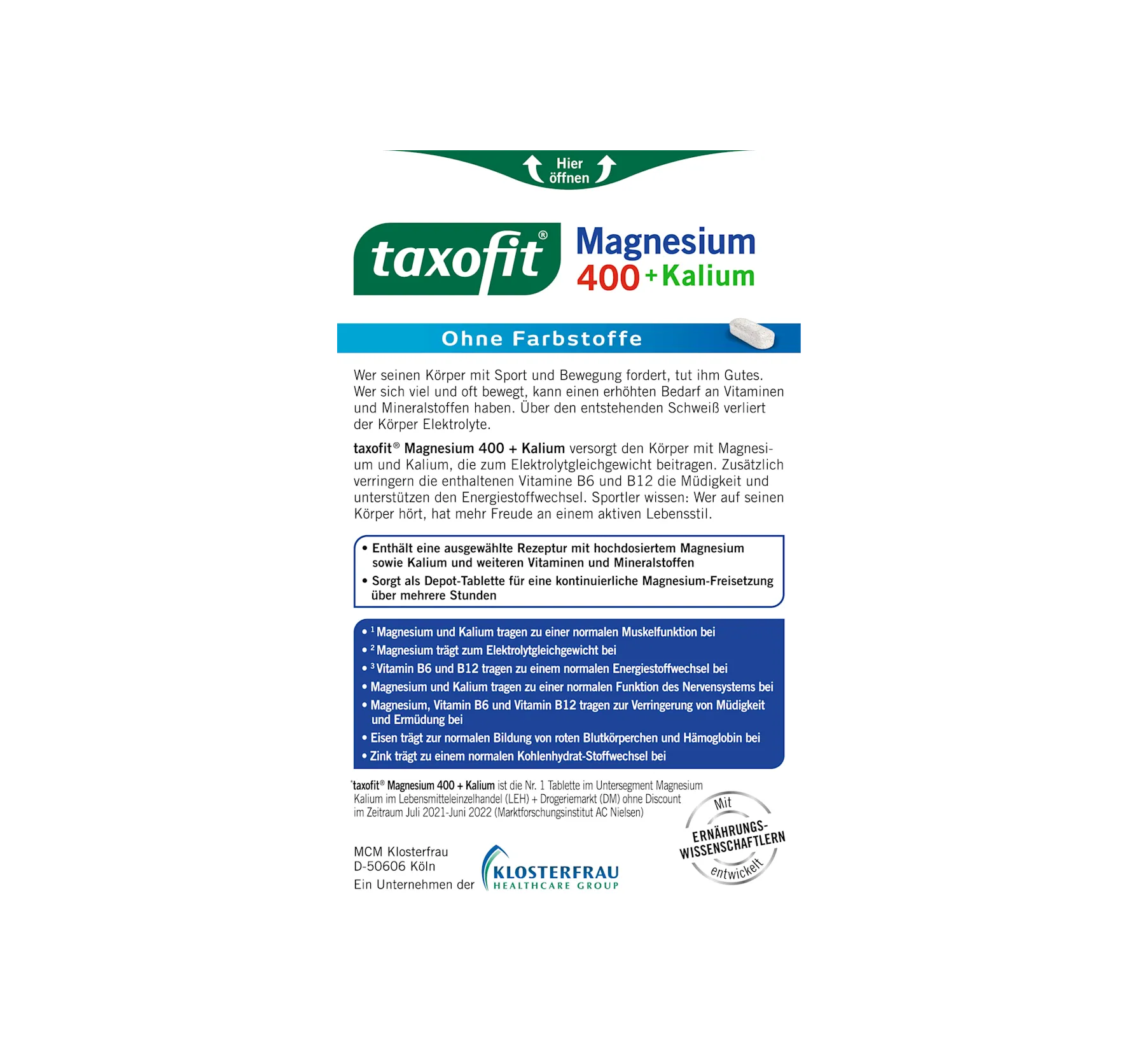 taxofit Magnesium 400 + Potassium provides the body with magnesium, which contributes to electrolyte balance, and potassium. Additionally, vitamins B6 and B12 support energy metabolism. Iron con...