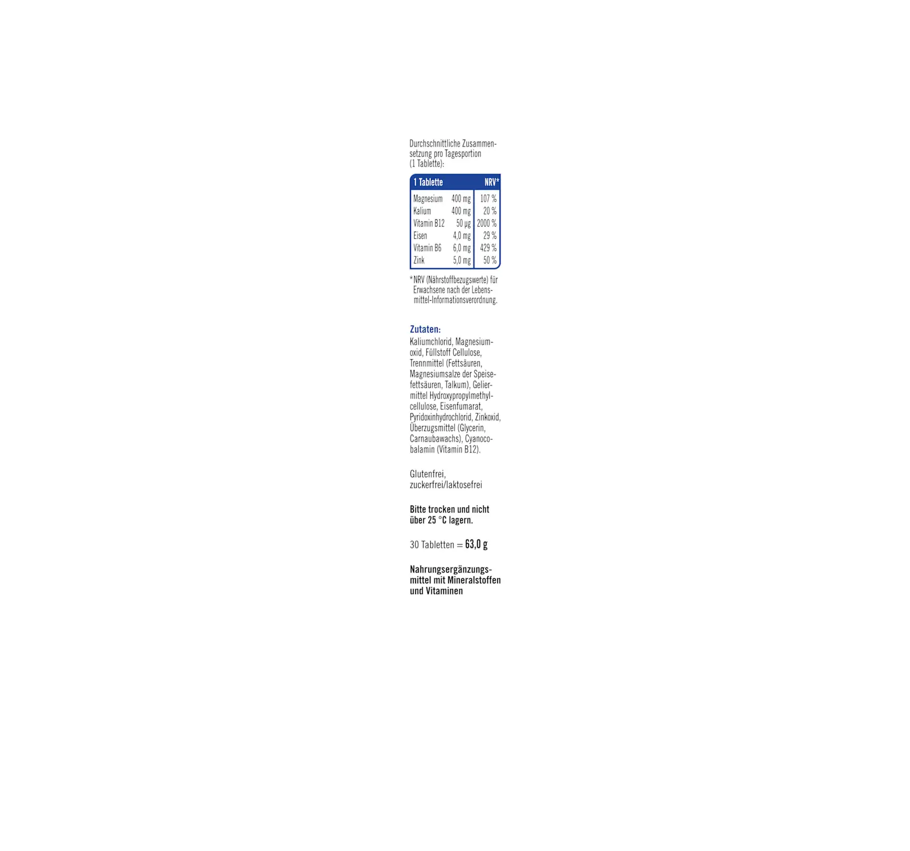 EXACT PRODUCT NAME: DIETARY SUPPLEMENT WITH MINERALS AND VITAMINS. INGREDIENTS: POTASSIUM CHLORIDE, MAGNESIUM OXIDE, BULKING AGENT CELLULOSE, ANTI-CAKING AGENTS (FATTY ACIDS, MAGNESIUM SALTS OF FATTY ACIDS, TALC), GELLING AGENT HYDROXYPROPYLMETHYLCELLULOSE, FERROUS FUMARATE, PYRIDOXINE HYDROCHLORIDE, ZINC OXIDE, GLAZING AGENTS (GLYCERIN, CARNAUBA WAX), CYANOCOBALAMIN (VITAMIN B12). PLEASE NOTE THE ALLERGEN INFORMATION.