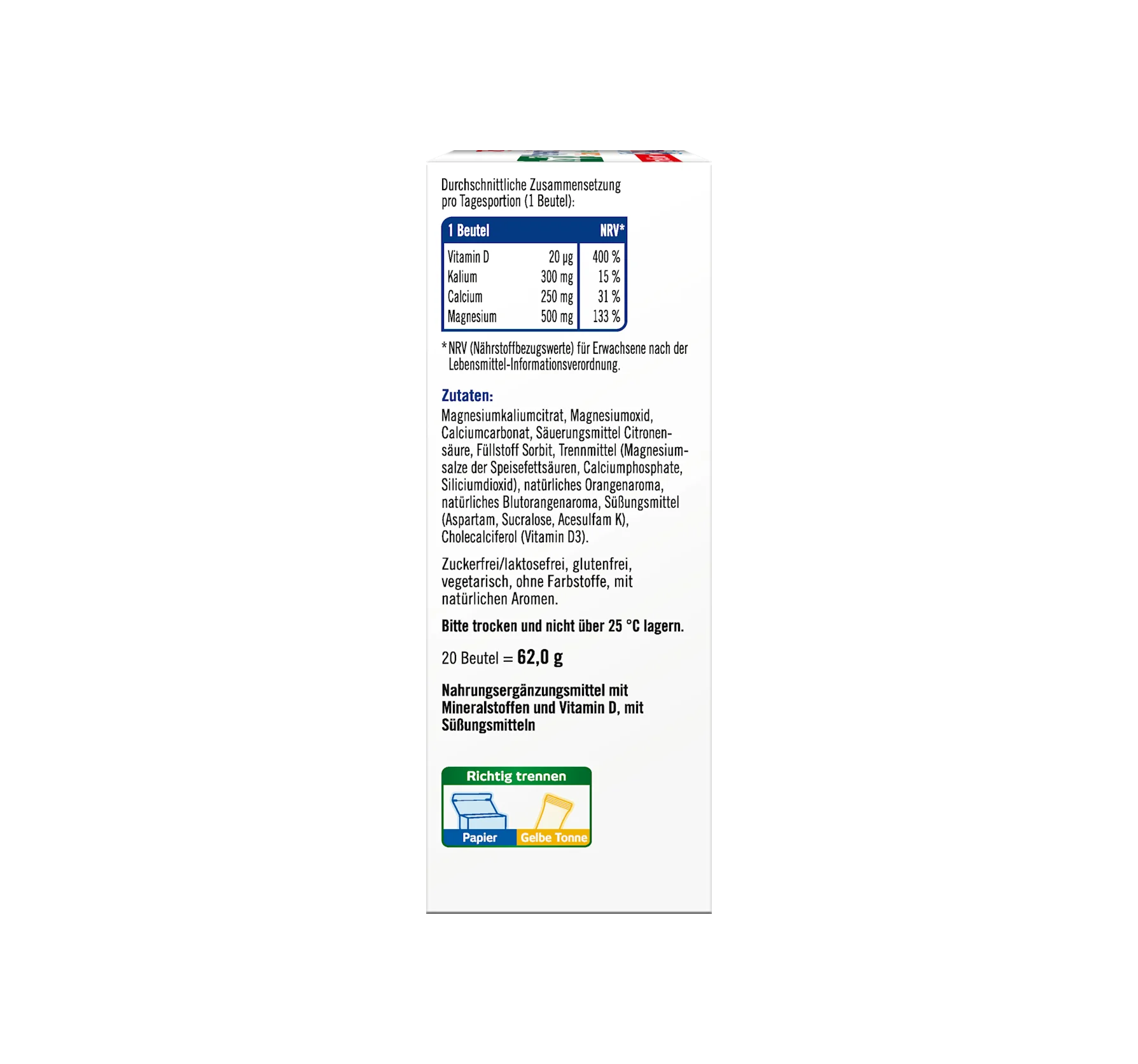 EXACT PRODUCT NAME: FOOD SUPPLEMENT WITH MINERALS AND VITAMIN D, WITH SWEETENERS. INGREDIENTS: MAGNESIUM POTASSIUM CITRATE, MAGNESIUM OXIDE, CALCIUM CARBONATE, ACIDIFIER CITRIC ACID, BULKING AGENT SORBITOL, ANTI-CAKING AGENTS (MAGNESIUM SALTS OF FATTY ACIDS, CALCIUM PHOSPHATES, SILICON DIOXIDE), NATURAL ORANGE FLAVOR, NATURAL BLOOD ORANGE FLAVOR, SWEETENERS (ASPARTAME, SUCRALOSE, ACESULFAME K), CHOLECALCIFEROL (VITAMIN D3). PLEASE NOTE THE ALLERGEN INFORMATION.