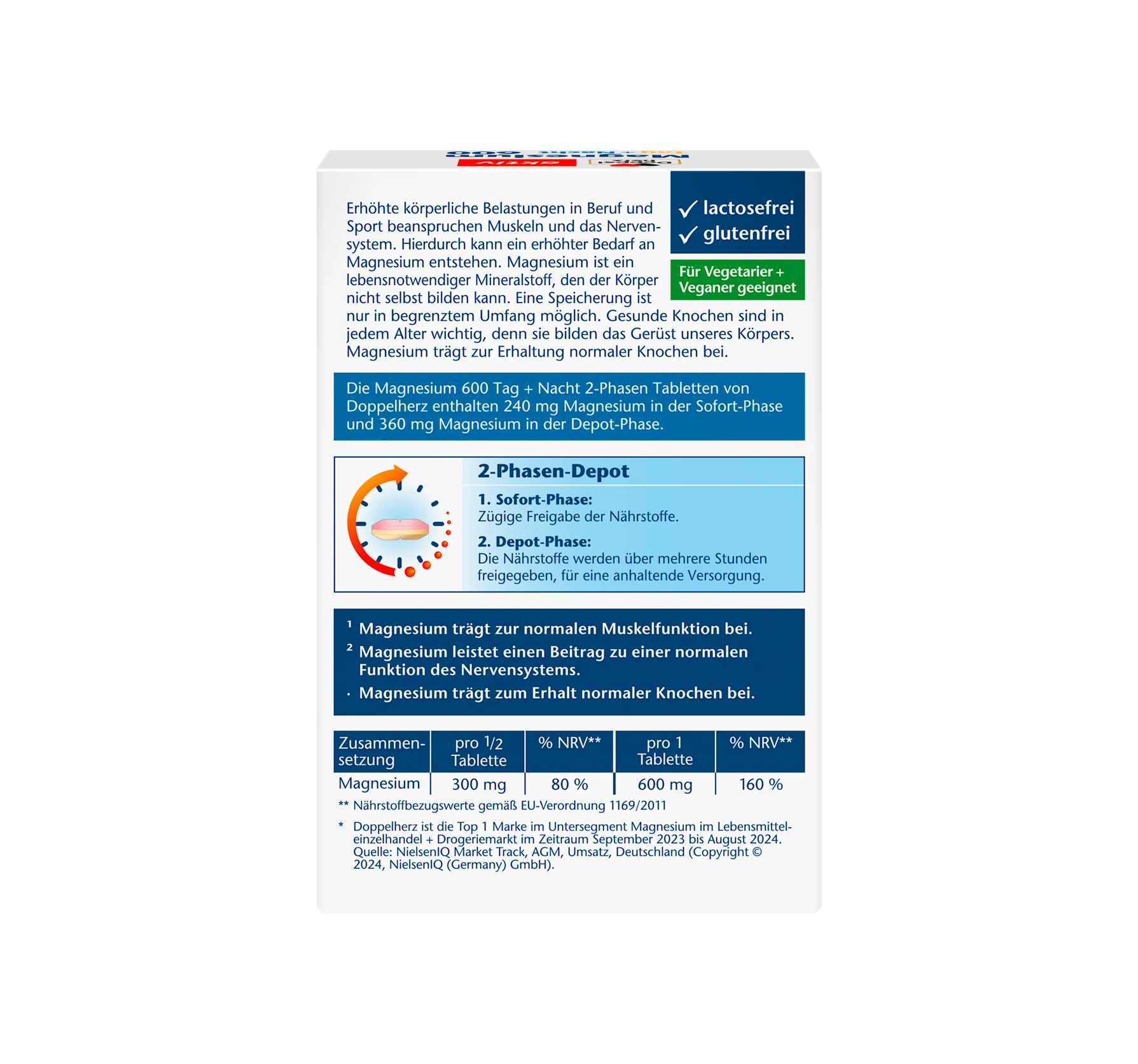 Doppelherz's Magnesium 600 Day + Night Depot Tablets provide targeted magnesium supply in two phases: 240 mg of magnesium is released immediately, while 360 mg is released over a longer period i...