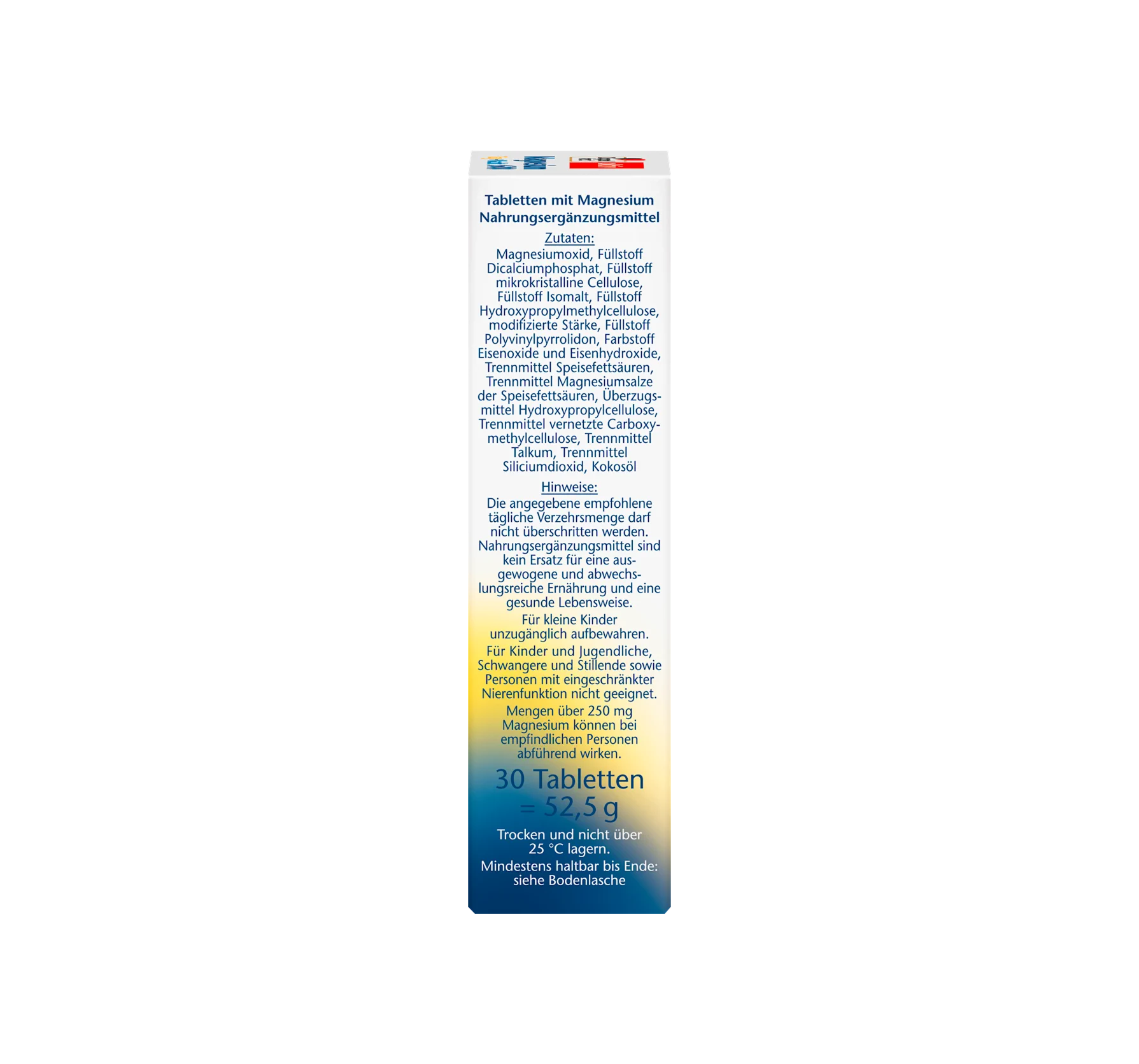 EXACT PRODUCT NAME: FOOD SUPPLEMENT TABLETS WITH MAGNESIUM INGREDIENTS: MAGNESIUM OXIDE, FILLER DICALCIUM PHOSPHATE, FILLER MICROCRYSTALLINE CELLULOSE, FILLER ISOMALT, FILLER HYDROXYPROPYLMETHYLCELLULOSE, MODIFIED STARCH, FILLER POLYVINYLPYRROLIDONE, COLOR IRON OXIDES AND IRON HYDROXIDES, ANTI-CAKING AGENT FATTY ACIDS, ANTI-CAKING AGENT MAGNESIUM SALTS OF FATTY ACIDS, GLAZING AGENT HYDROXYPROPYLCELLULOSE, ANTI-CAKING AGENT CROSS-LINKED CARBOXYMETHYLCELLULOSE, ANTI-CAKING AGENT TALC, ANTI-CAKING AGENT SILICON DIOXIDE, COCONUT OIL PLEASE NOTE THE INFORMATION ON ALLERGENS.