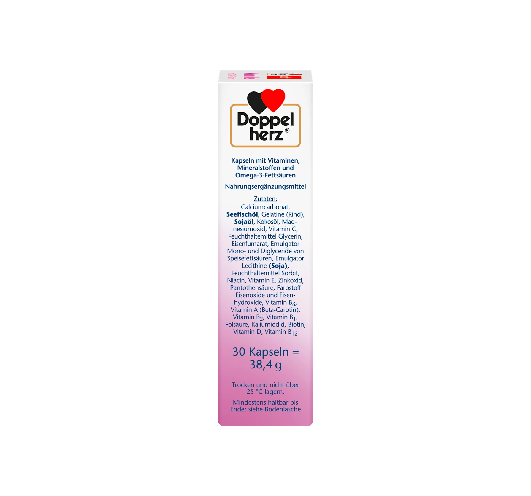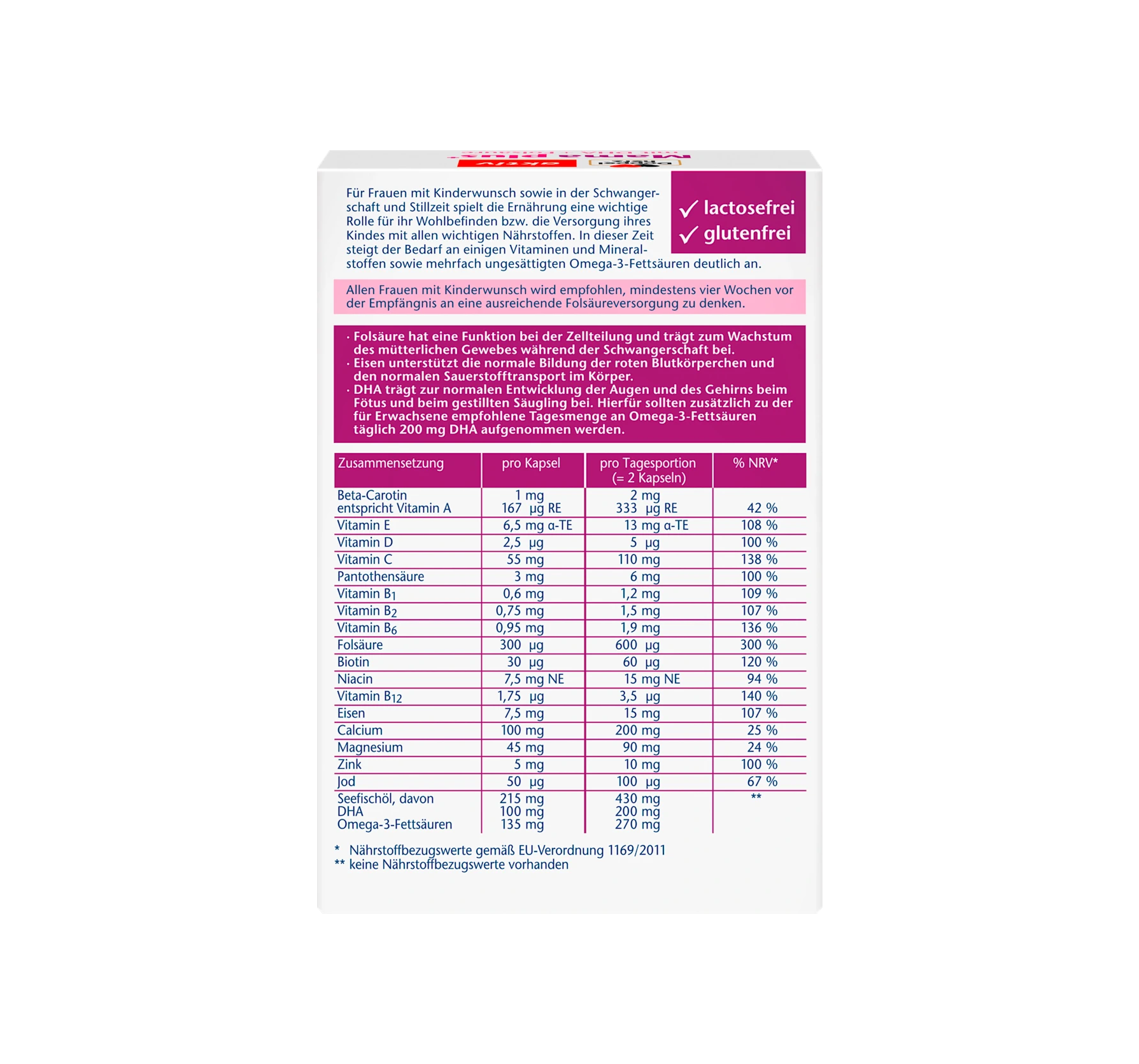 Doppelherz Mama plus+ capsules with DHA + folic acid provide 600 μg of folic acid along with all other B vitamins and the minerals calcium, magnesium, iron, zinc, and 100 μg of iodine. The capsu...
