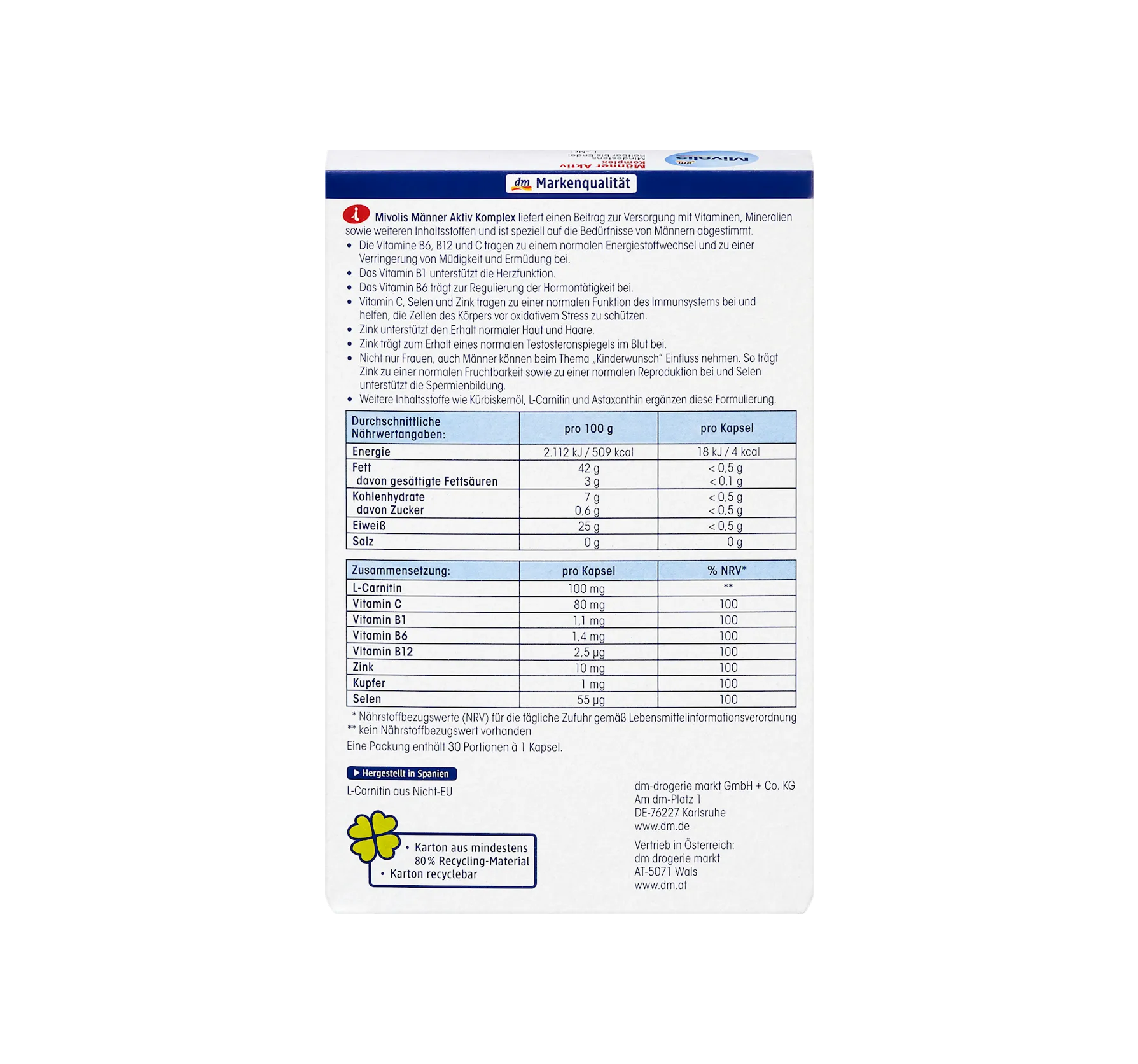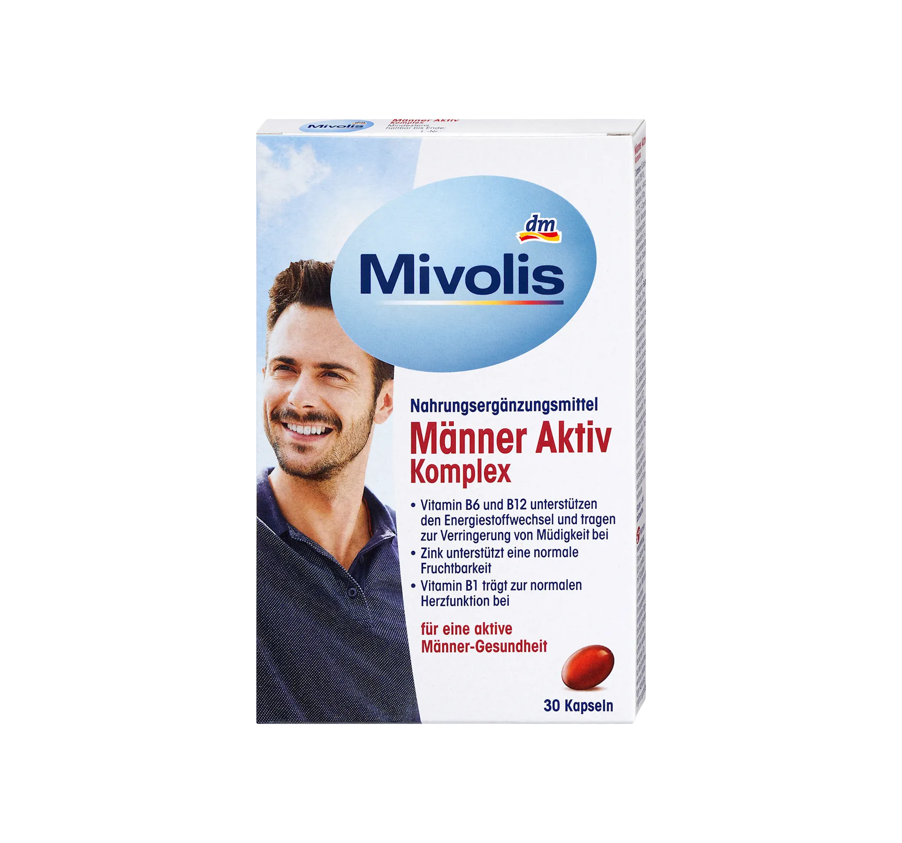 Mivolis Men's Active Complex Capsules contribute to the supply of vitamins, minerals, and other high-quality ingredients and are specially tailored to the needs of men. - Vitamins B6, B12, and C...