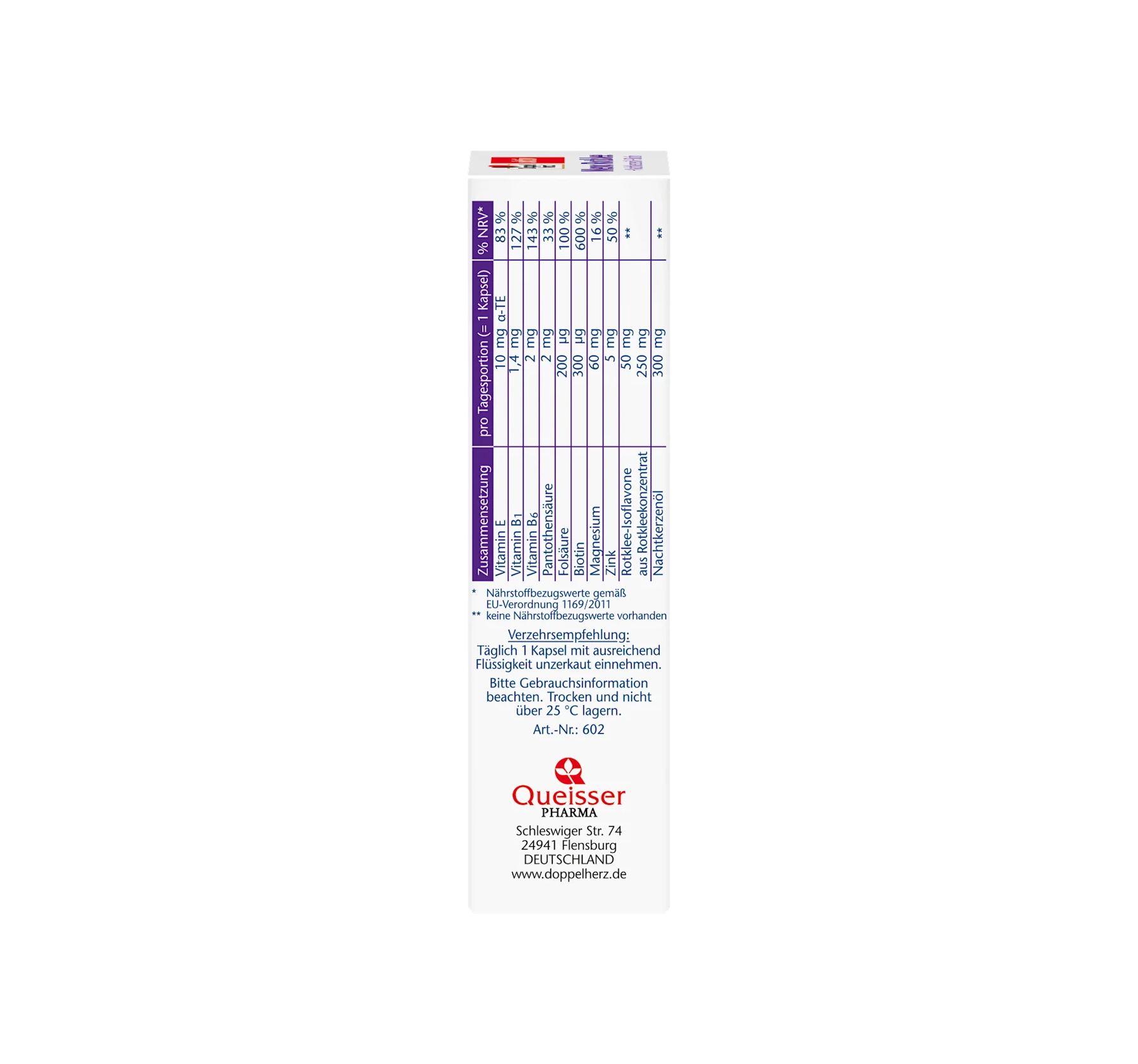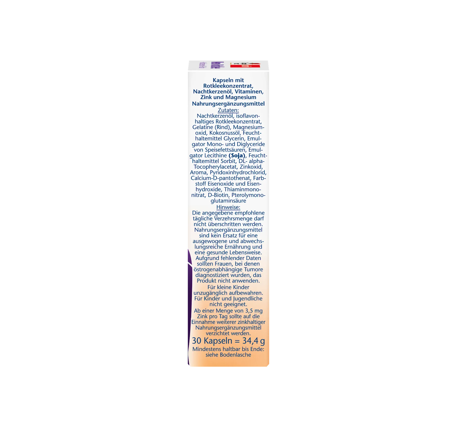 EXACT PRODUCT NAME: CAPSULES WITH RED CLOVER CONCENTRATE, EVENING PRIMROSE OIL, VITAMINS, ZINC AND MAGNESIUM. FOOD SUPPLEMENT. INGREDIENTS: EVENING PRIMROSE OIL, ISOFLAVONE-CONTAINING RED CLOVER CONCENTRATE, GELATIN (BEEF), MAGNESIUM OXIDE, COCONUT OIL, HUMECTANT GLYCEROL, EMULSIFIER MONO- AND DIGLYCERIDES OF FATTY ACIDS, EMULSIFIER LECITHINS (SOY), HUMECTANT SORBITOL, DL-ALPHA-TOCOPHERYL ACETATE, ZINC OXIDE, FLAVORING, PYRIDOXINE HYDROCHLORIDE, CALCIUM D-PANTOTHENATE, COLOR IRON OXIDES AND IRON HYDROXIDES, THIAMINE MONONITRATE, D-BIOTIN, PTEROYLMONOGLUTAMIC ACID. PLEASE NOTE THE INFORMATION ON ALLERGENS.