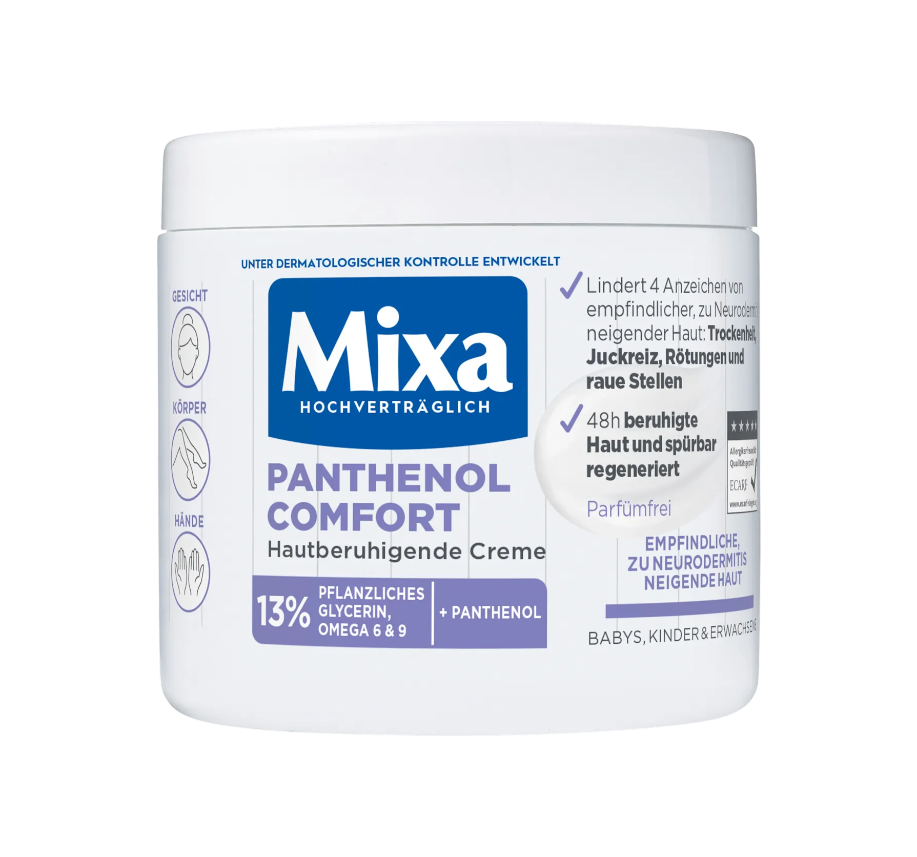 The skin-soothing Mixa Panthenol Comfort Care Cream is a gentle treatment for the face, body, and hands. It is specially formulated for the needs of skin prone to atopic dermatitis and leaves sk...