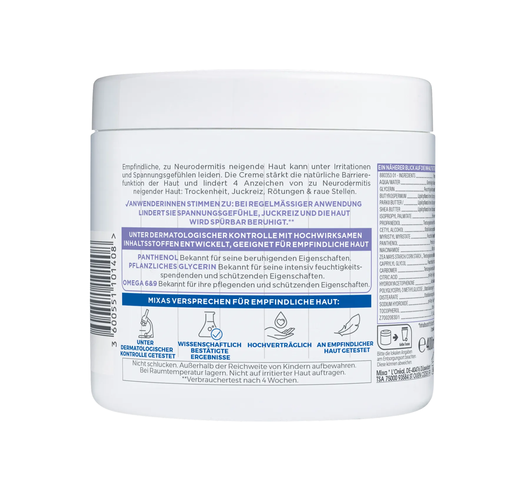 Mixa Skin Soothing Cream is suitable for the care of skin prone to atopic dermatitis on the face, body, and hands. The cream with panthenol can be applied to the skin after cleansing or as needed, and then massaged in with gentle circular motions. Allow the skincare product to absorb completely before getting dressed. Avoid the eye area when applying the cream. Do not swallow. Keep out of reach of children.