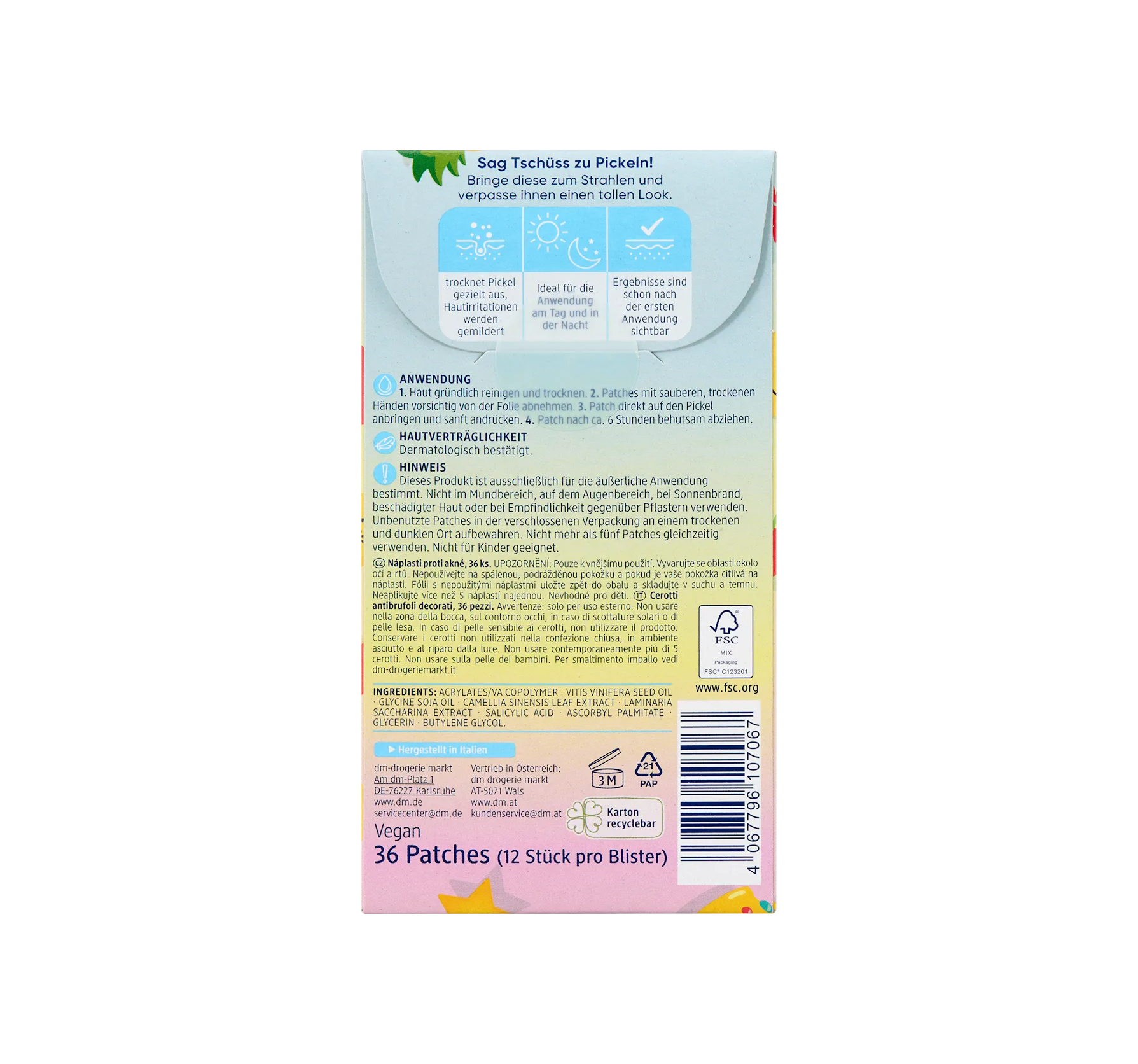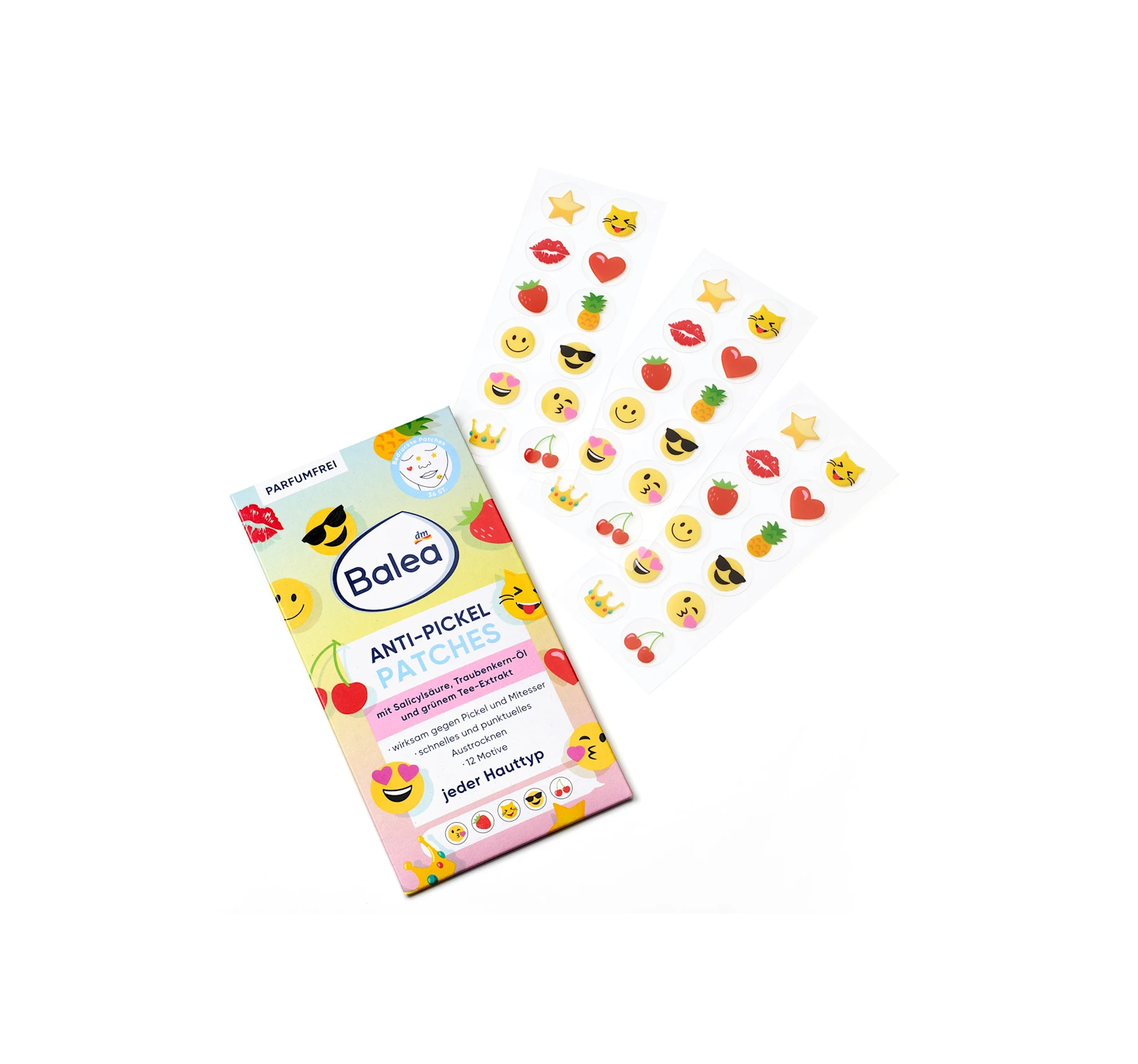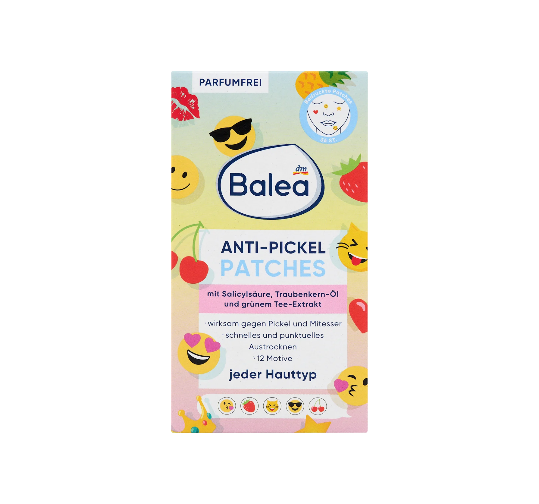 Balea's printed anti-pimple patches offer a targeted solution for quickly drying out pimples and blackheads. Results are visible after the first application, and the patches are ideal for both d...