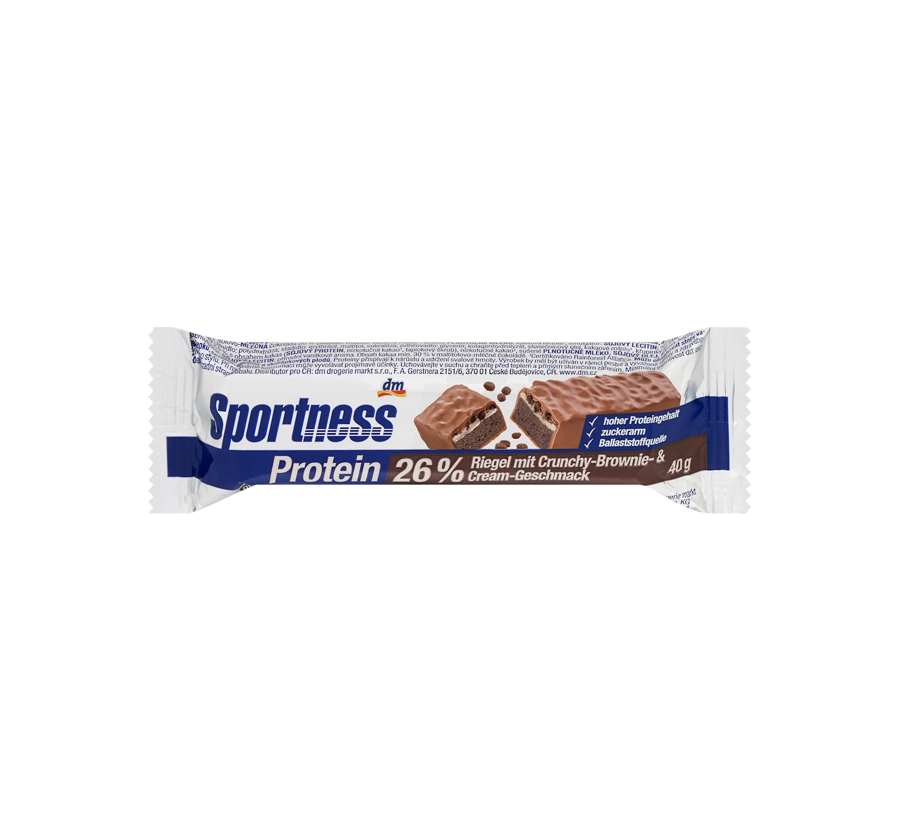 High protein content, low sugar, source of fiber, with crunchy brownie cream flavor. The low-sugar Sportness protein bar with crunchy brownie & cream flavor impresses with a high protein con...