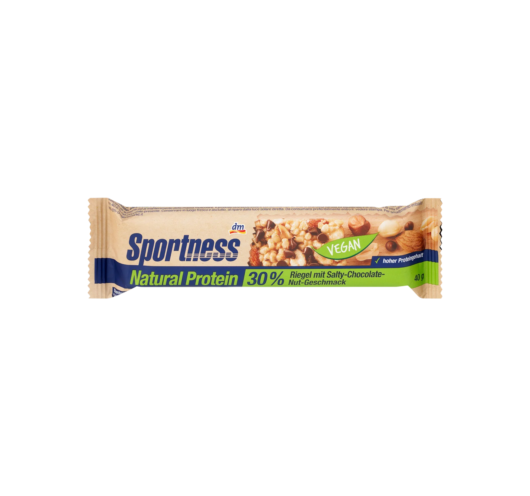 Ingredients: Exact product name: Sportness Protein 30% bar with protein, peanuts, almonds, hazelnuts, and chocolate drops. Salty Chocolate Nut flavor. Vegan.