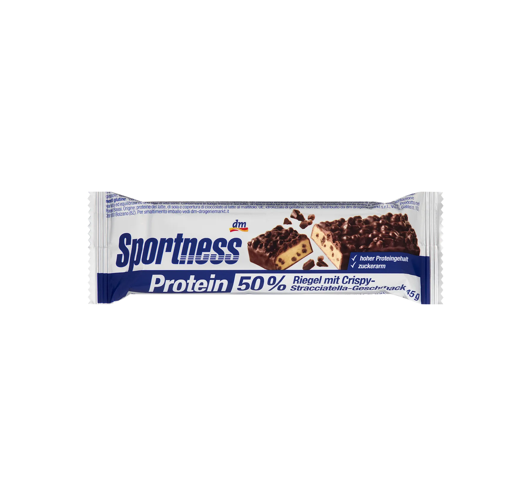 High protein, Low sugar, Stracciatella flavor, Coated in dark maltitol chocolate. The Sportness 50% Protein Bar with Crispy Stracciatella flavor is a delicious protein bar coated in dark maltito...