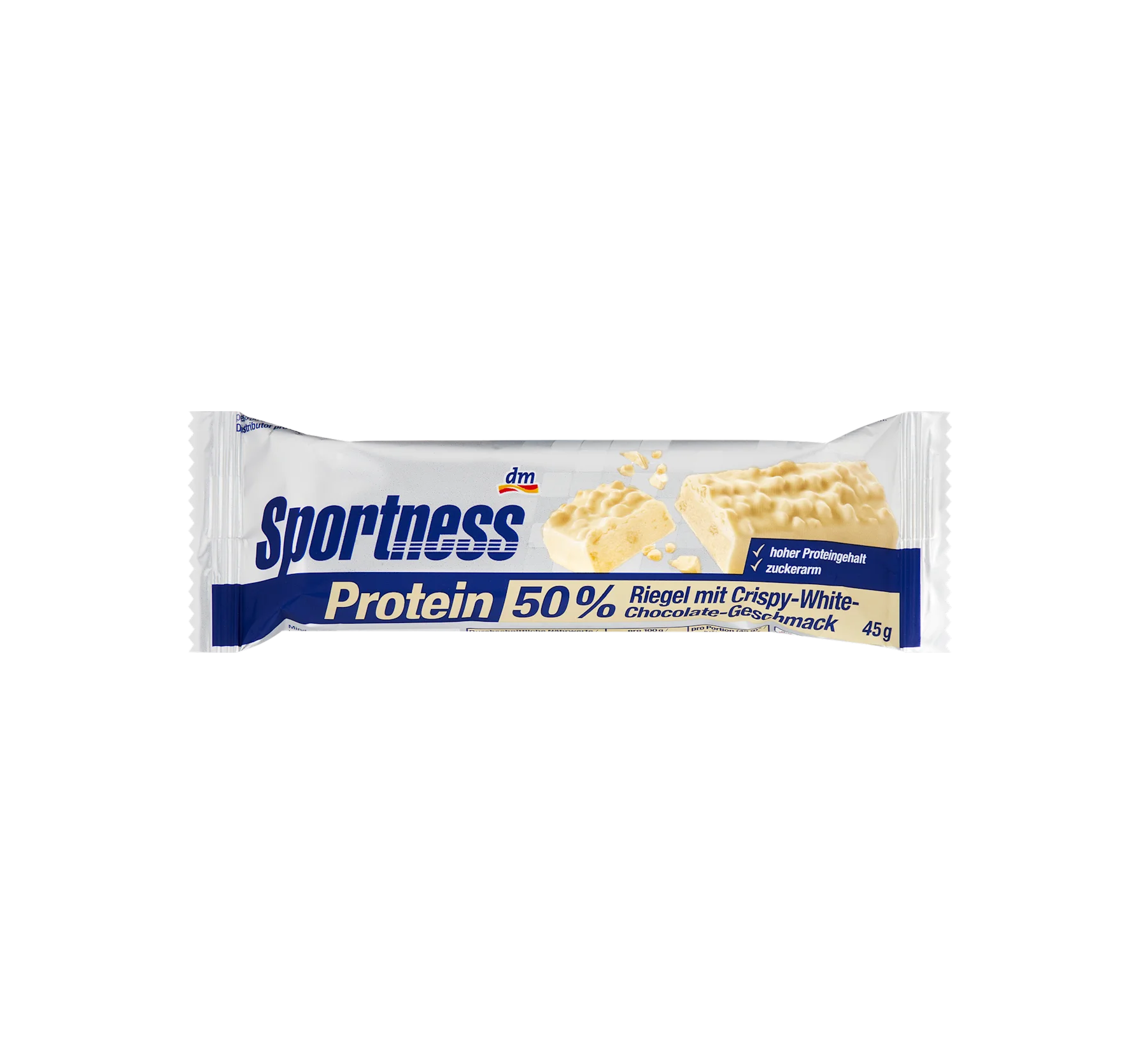 Ingredients: Exact product name: Sportness Protein 50% Bar with protein, crispy white chocolate flavor, coated with white maltitol chocolate, with sweeteners