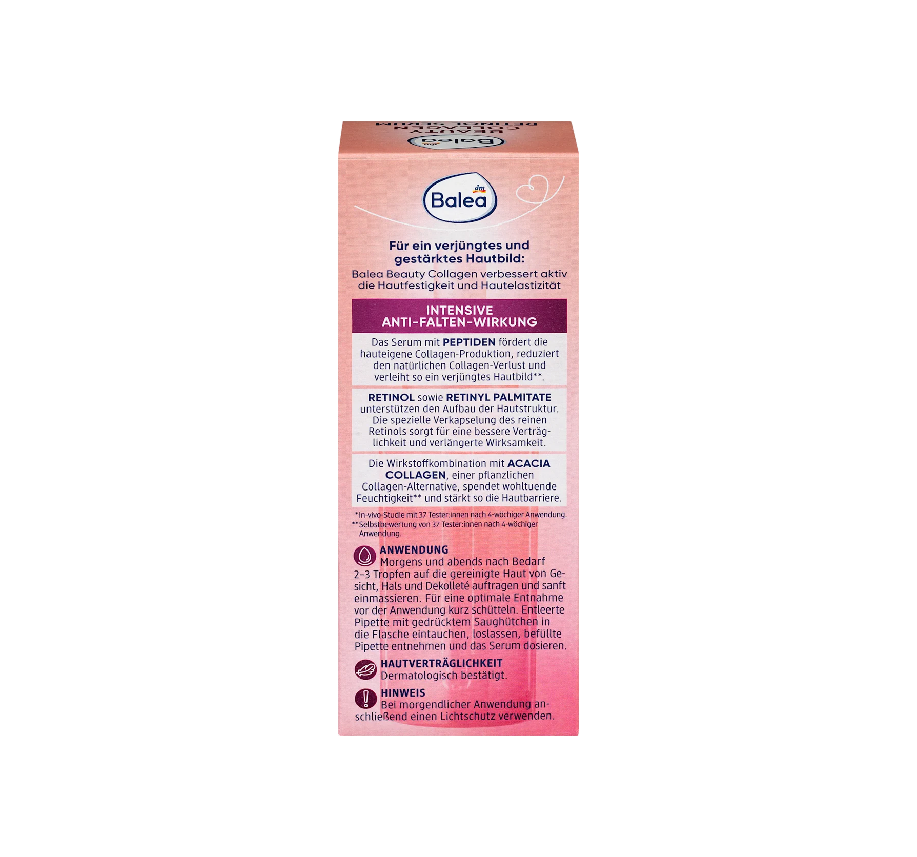 For a rejuvenated and strengthened complexion: The Balea Beauty Collagen Retinol Serum actively improves skin firmness and elasticity. The serum with peptides pr...