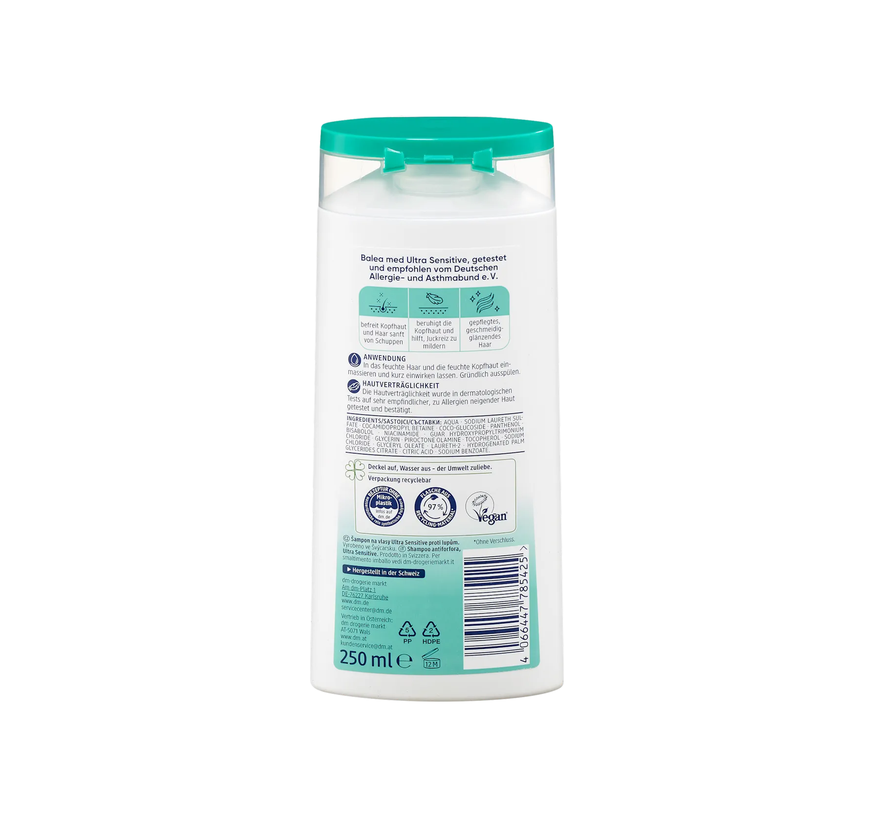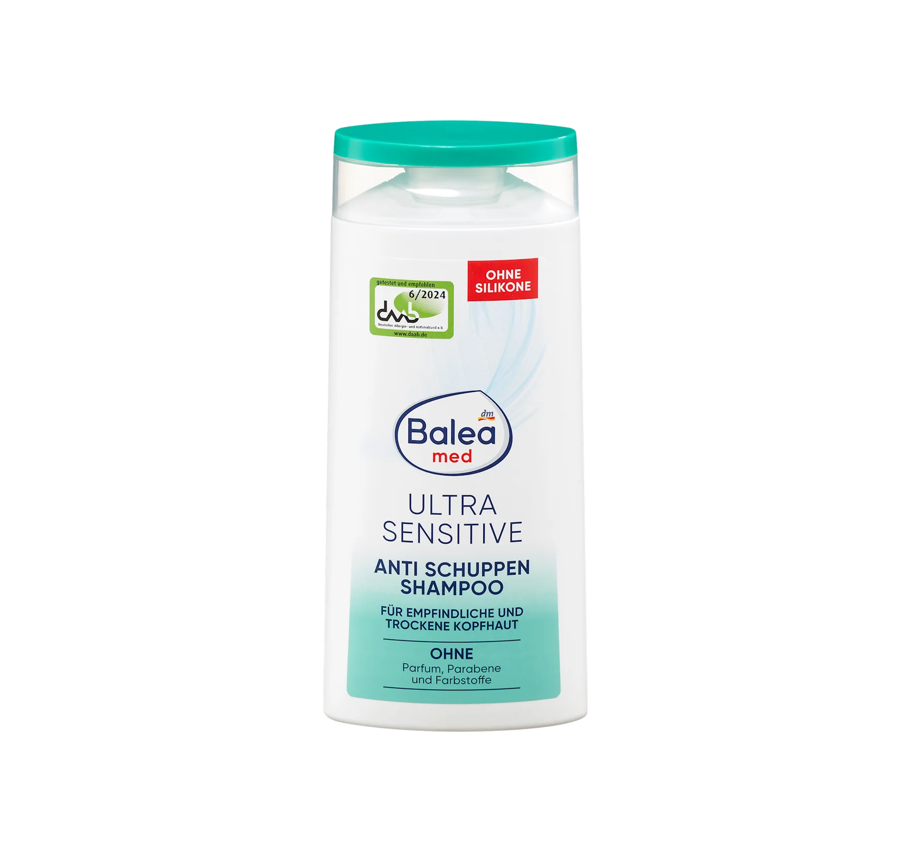 Balea med's Anti-Dandruff Ultra Sensitive Shampoo is especially suitable for sensitive and allergy-prone skin. It gently removes dandruff from the scalp and hair. It also soothes the skin and he...